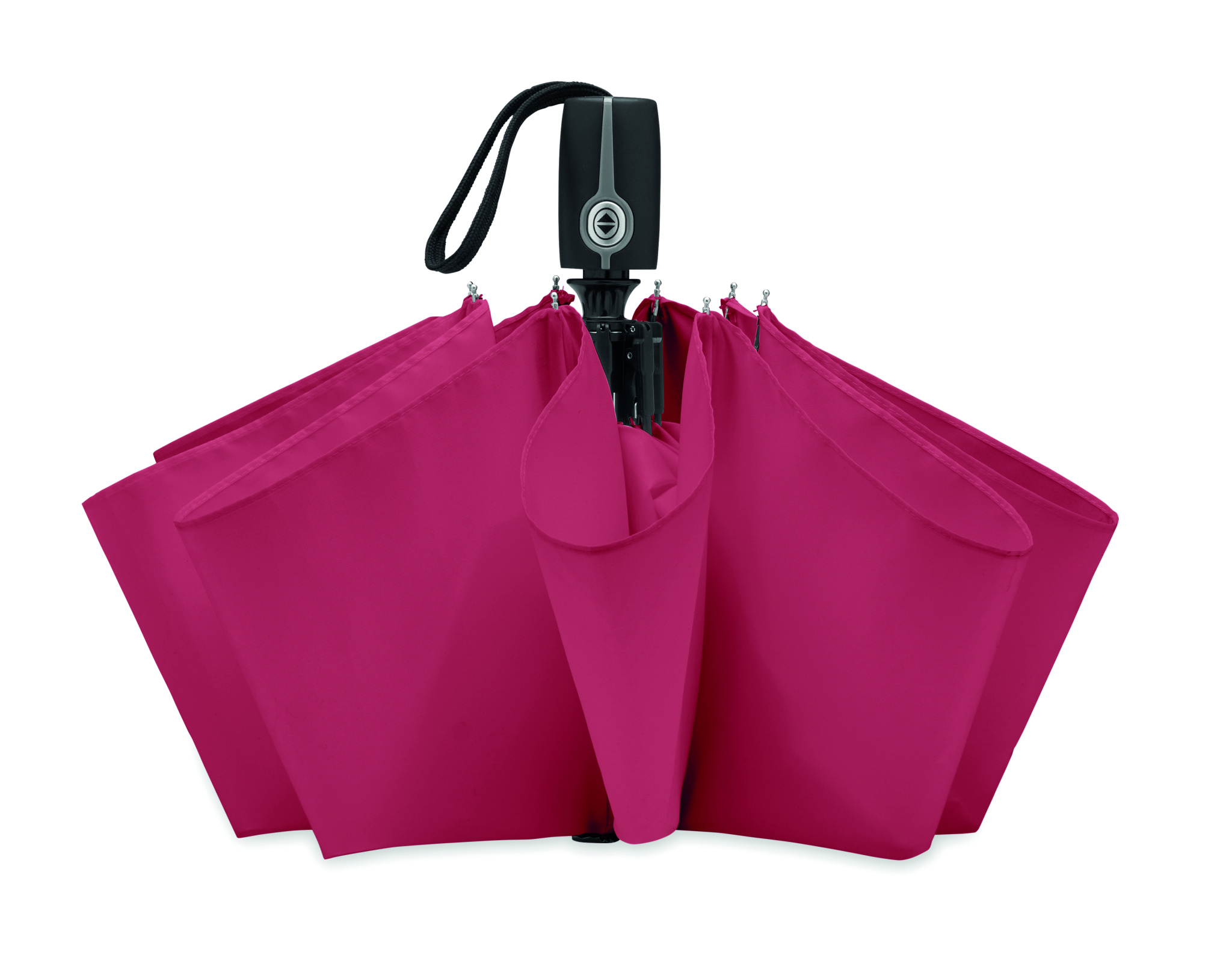 21'' Regenschirm aus 190T Seide. Windbeständig. Gestell aus verzinktem Stahl. Schienen aus schwarzem Fiberglas, Spitzen aus verchromtem Metall. Schwarz gummierter Griff mit Doming. 3fach faltbar. Passende Schirmhülle. Automatische Öffnung und Schließung.