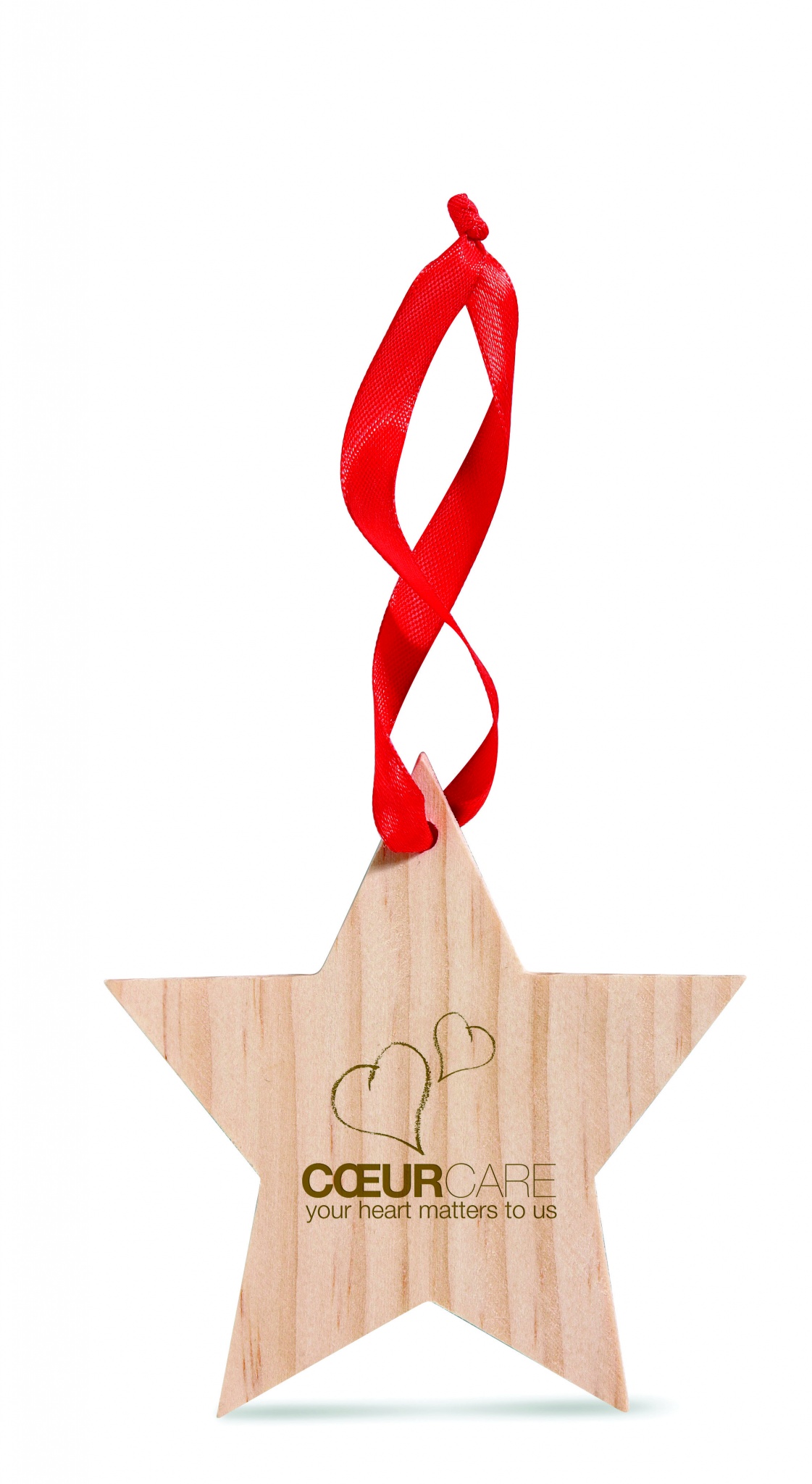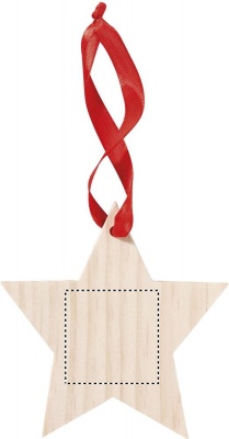 Anhänger aus Holz in Form eines Sterns. Mit rotem Aufhängeband.