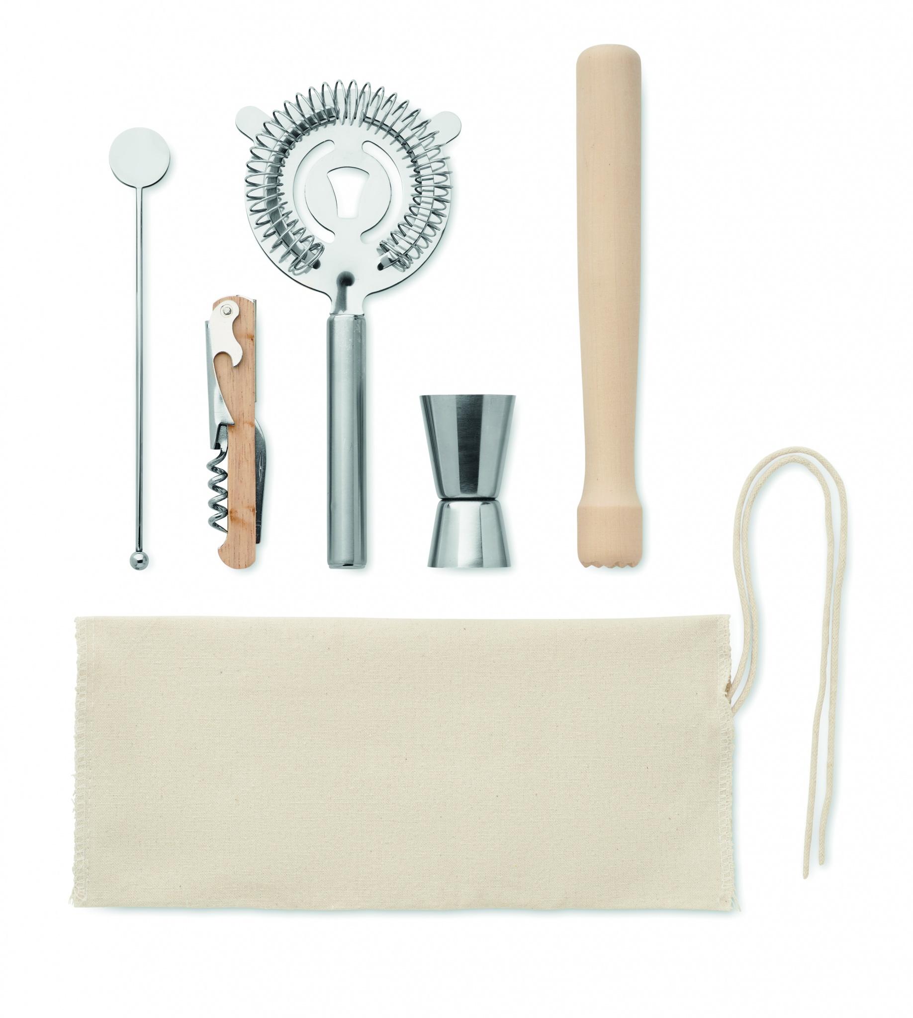 Cocktail-Set im Baumwollbeutel 220g/m² mit Kordelverschluss. Inkl. Messbecher (15 & 30 ml), Stößel aus Holz, Cocktail-Sieb, Barlöffel und Korkenzieher.