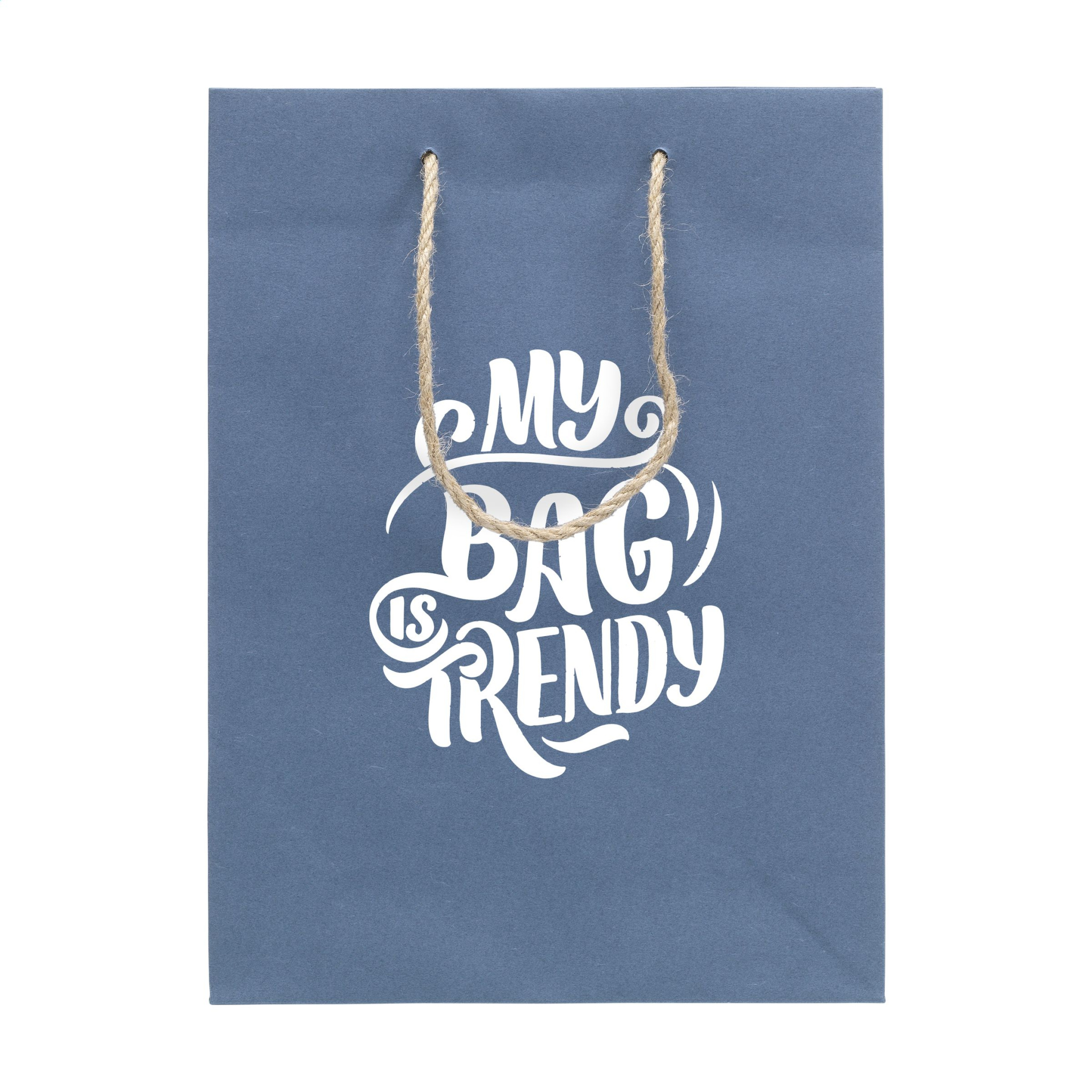WoW! Stabile ECO Geschenktüte (Größe M) aus Recyclingpapier mit Jeansfasern (180 g/m²). Durch die Verwendung von recyceltem Jeansstoff kann der Blauton je nach Tüte unterschiedlich sein. Die blaue Farbe verleiht der Tüte einen trendigen Look. Die Tüte hat zwei kurze Jute-Trageschlaufen, einen gefalteten Boden und eine Seitenfalte. Geeignet für Werbezwecke aller Art. Für die Herstellung dieser Tüte werden keine Bäume gefällt.