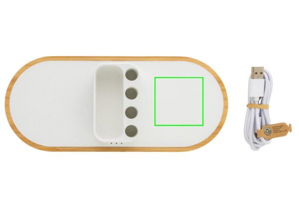Schneller 10W-Dual-Wireless-Charger mit Stifthalter aus RCS-zertifiziert (Recycled Claim Standard) recyceltem ABS. Gesamter Recyclinganteil: 31% basierend auf dem Gesamtgewicht des Artikels. Die RCS-Zertifizierung gewährleistet eine vollständig zertifizierte Lieferkette der recycelten Materialien. Die Basis besteht aus 100% FSC®Bambus. Kabelloses Laden ist kompatibel mit Android der neuesten Generation, iPhone 8 und höher. Kann zwei Telefone gleichzeitig oder jedes andere QI-fähige Gerät aufladen. Mit 4 Stiftlöchern zum Aufbewahren von Stiften sowie einer kleiner Ablage für z.B. Visitenkarten oder andere kleine Gegenstände. Artikel und Zubehör PVC-frei. Inklusive 120cm Type-C Kabel aus RCS-zertifiziertem Recycling-TPE. Verpackt in FSC®Mix Kraftkarton. Type-C Input: 5V/2A; 9V/2A; Wireless Output: 5V/1A; 9V/1,1A; (10W) Registered Design®