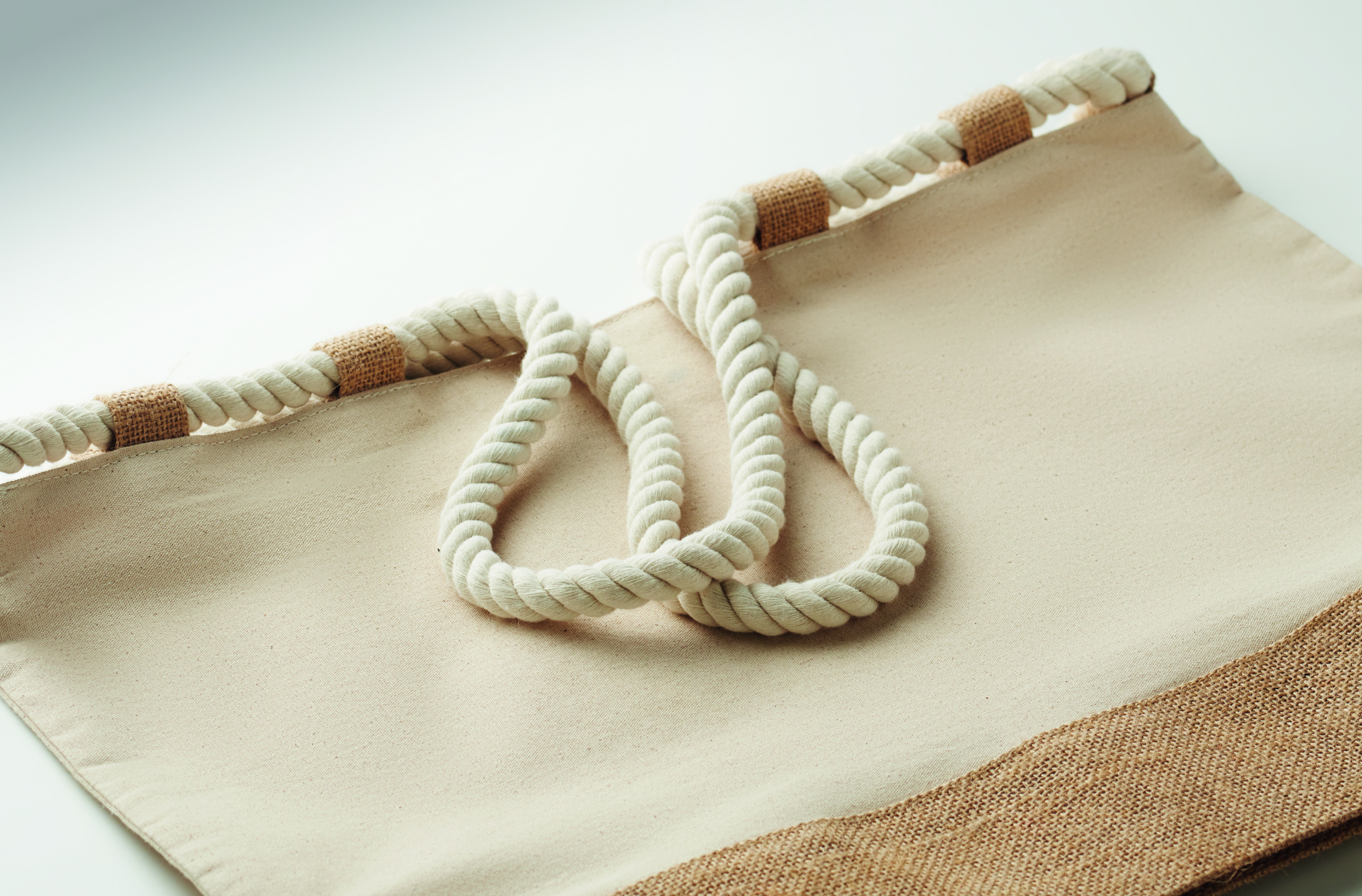 Strand- oder Einkaufstasche aus Canvas und Dekor aus Jute. Mit Kordelgriff, Reißverschluss und 10 Schlaufen aus Jute. 280 g/m².