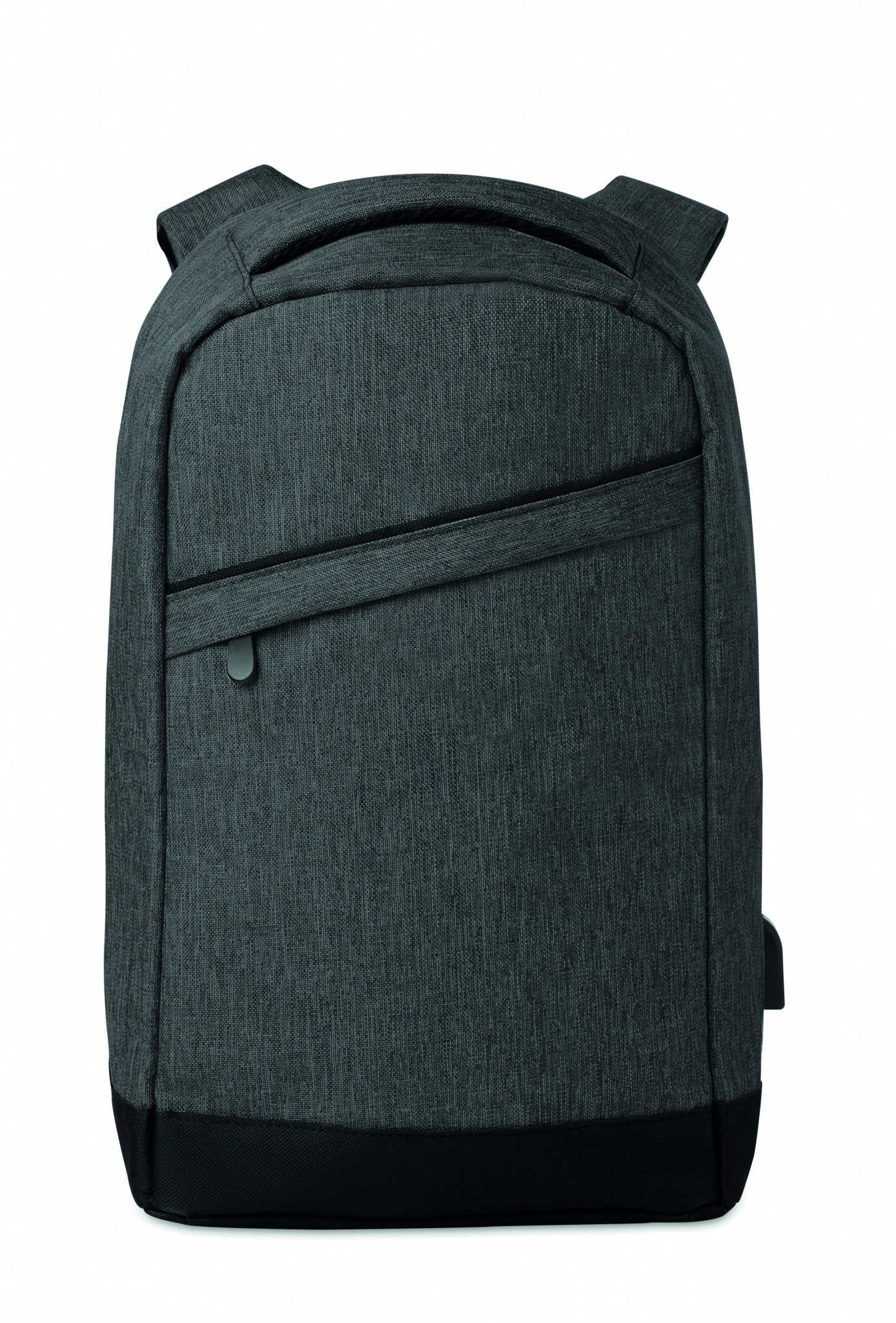 600D 2 tone Polyester backpack with padded shoulder strap with main internal compartment. Includes one internal 13'' laptop compartment and an USB charging cable. Zipper main compartment on backside for better protection.