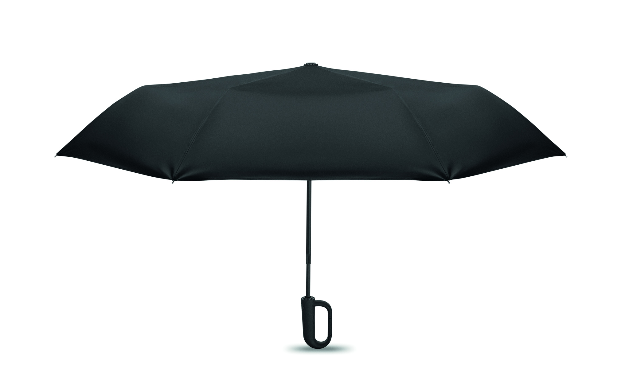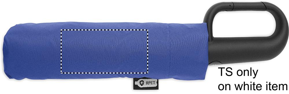 Foldable 21'' windproof umbrella with full black plating fibreglass frame with 2 sections. Fibreglass ribs. 190T RPET pongee panels. D shape carabiner handle w/ rubber finish. Auto open and closure. Includes pouch