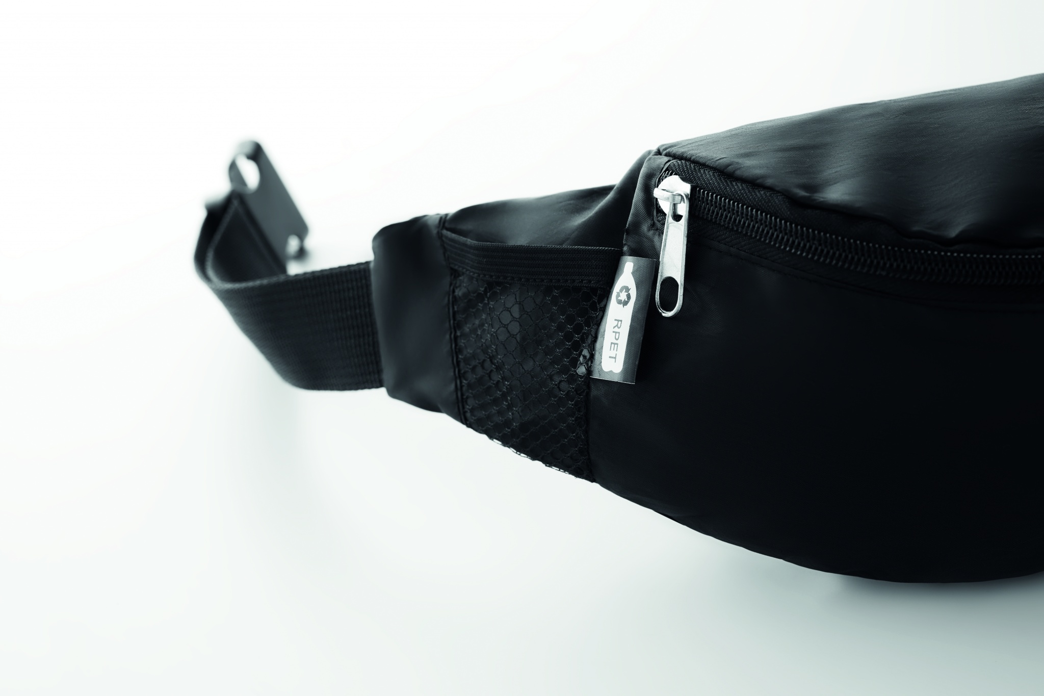 Fanny bag in 210D RPET with zippered main compartment and adjustable waist strap.