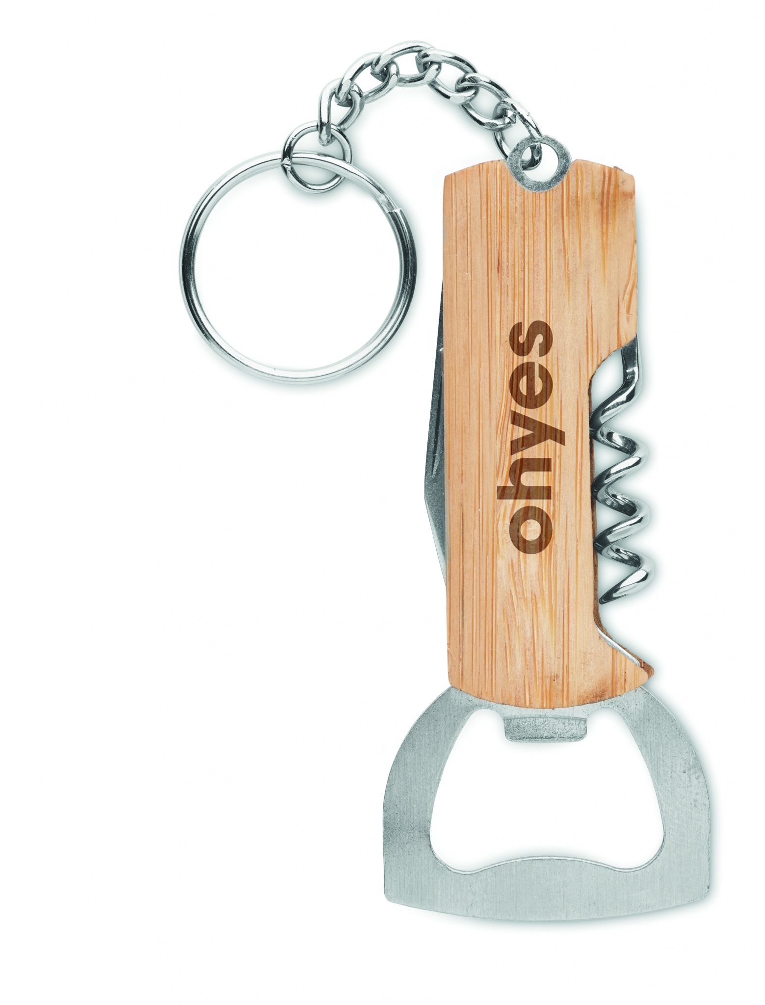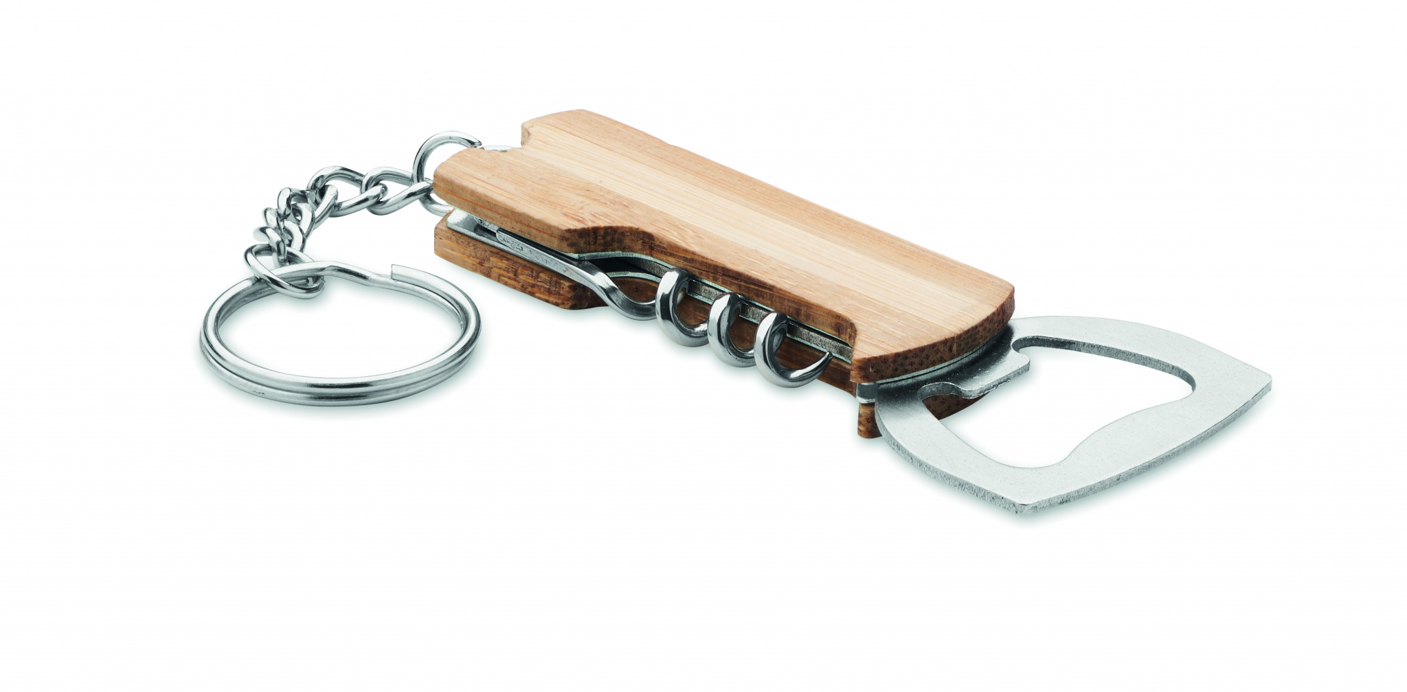 3 in 1 tool pocket with bamboo case and key ring. It includes a bottle opener, wine corkscrew opener and pocket knife.