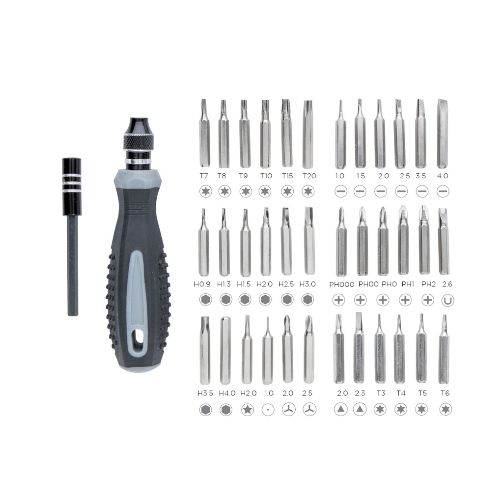 38 pcs tool set with PP bits holder. Bits made from carbon steel. ABS case with transparent top.