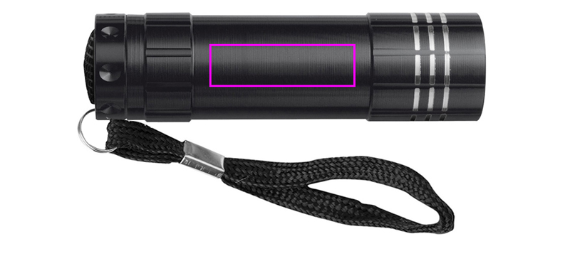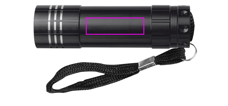 COB aluminum flashlight with six COB's. We apply your logo by means of a laser engraving on the center piece. Excluding three AAA batteries (order them immediately, see last page or article 999400).