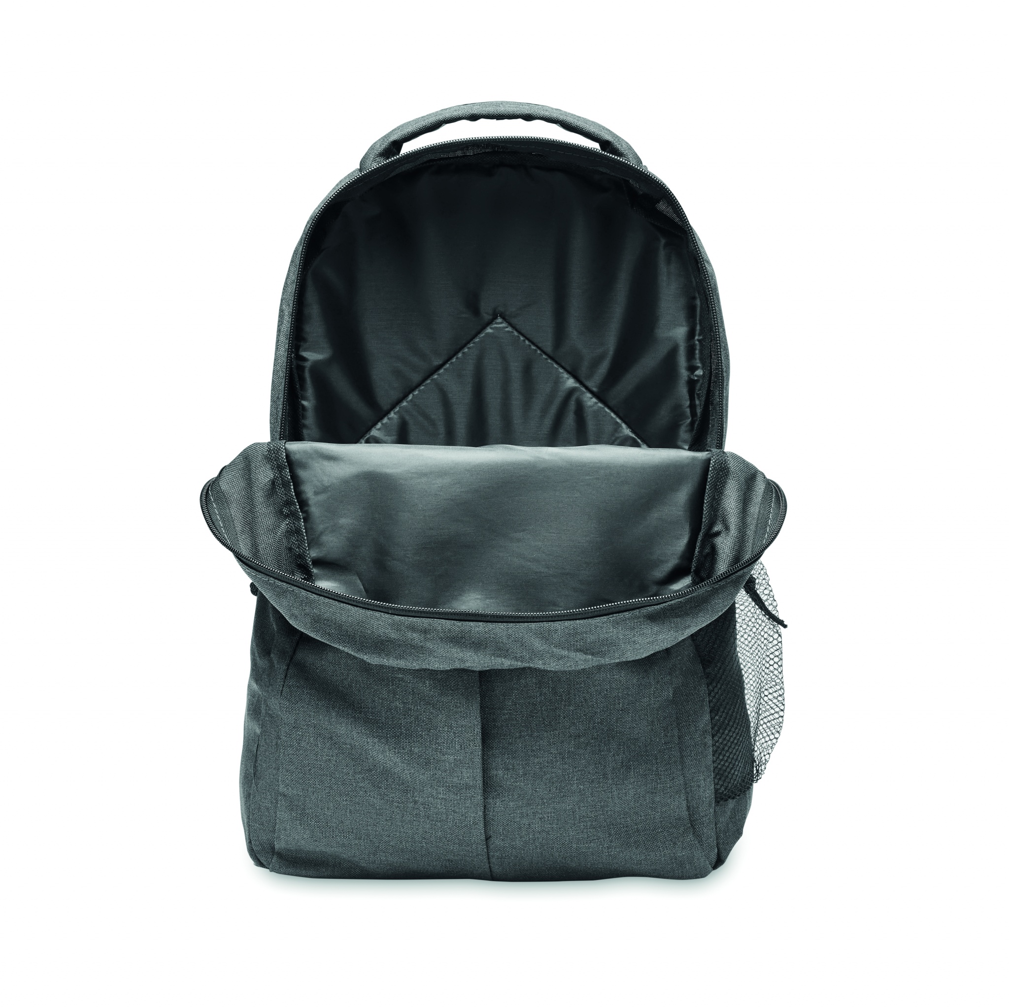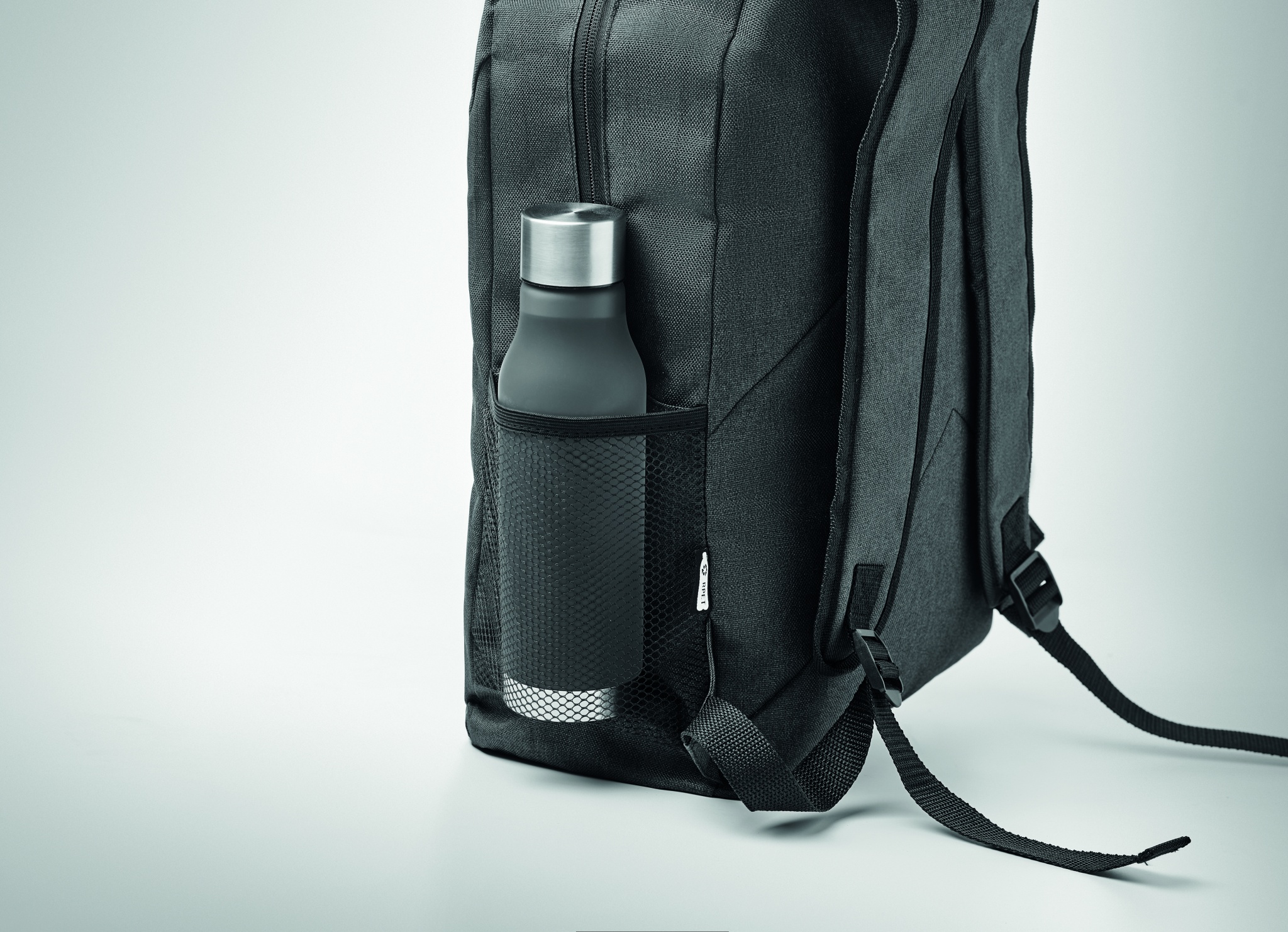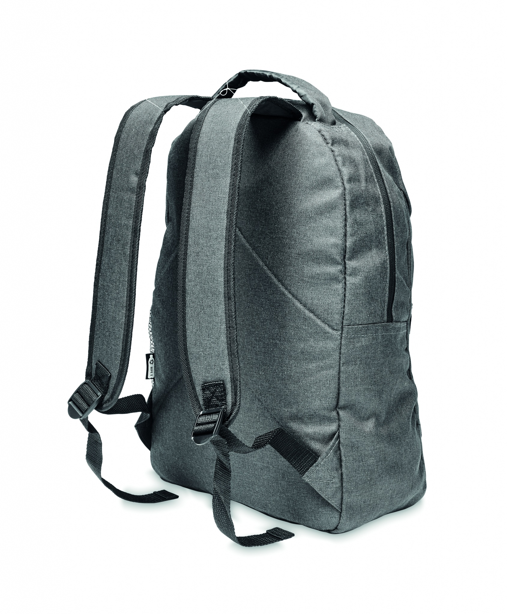 Backpack in 600D RPET 2 tone polyester with outside pocket with zipper and mesh pocket on the side.