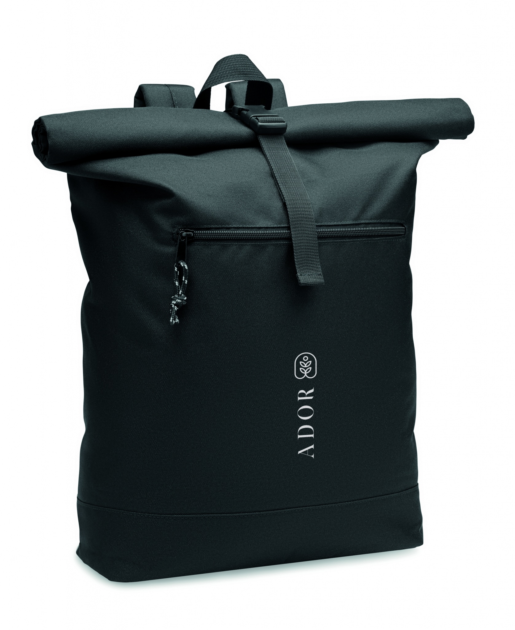 Rolltop backpack in 600D RPET polyester with padded back and bottom reinforcement. Zippered front pocket. The lining is in 210D RPET.