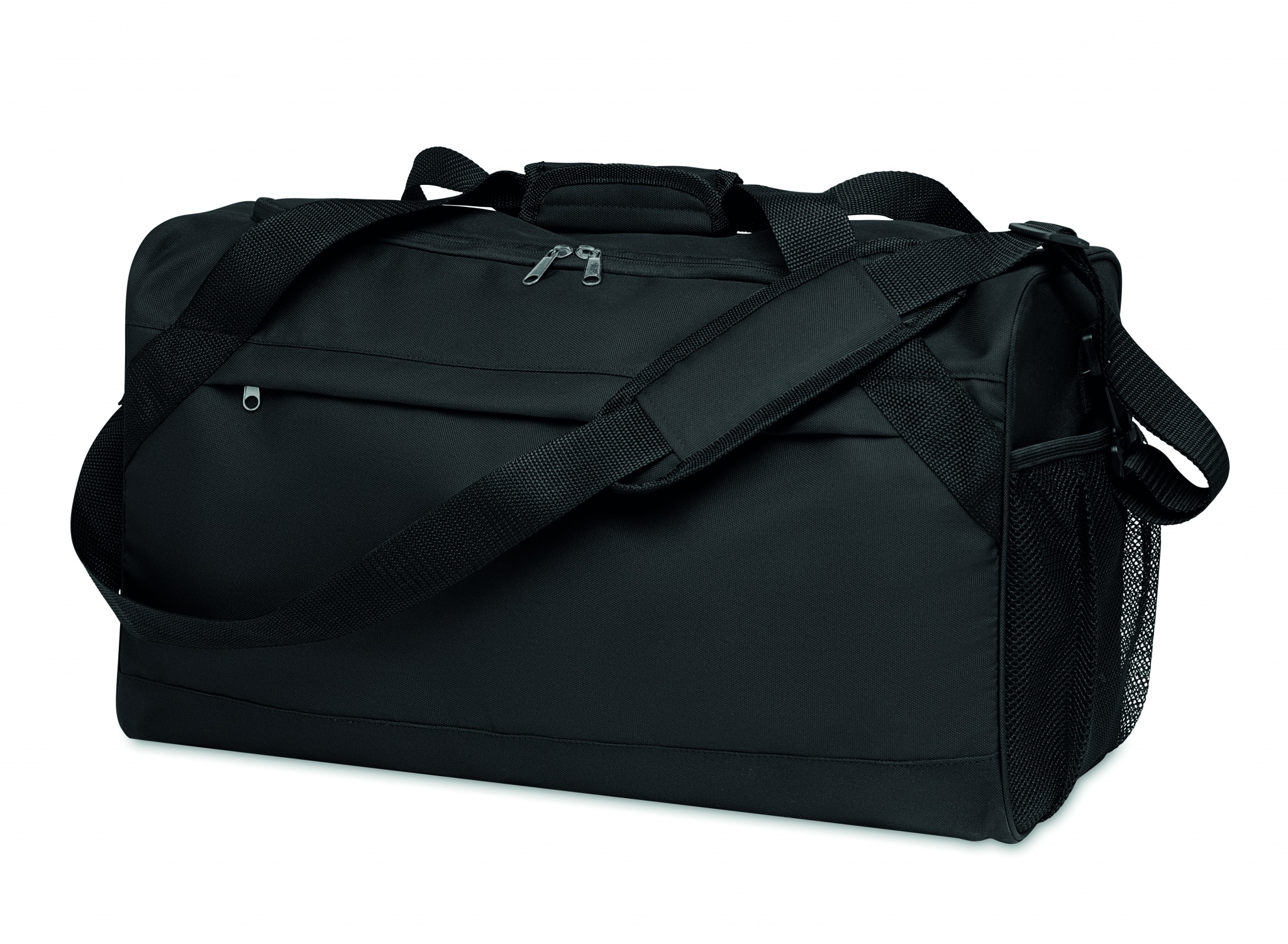 Sport or travelling bag in 600D RPET with large zippered front pocket, inside zippered pocket and adjustable and detachable shoulder strap.