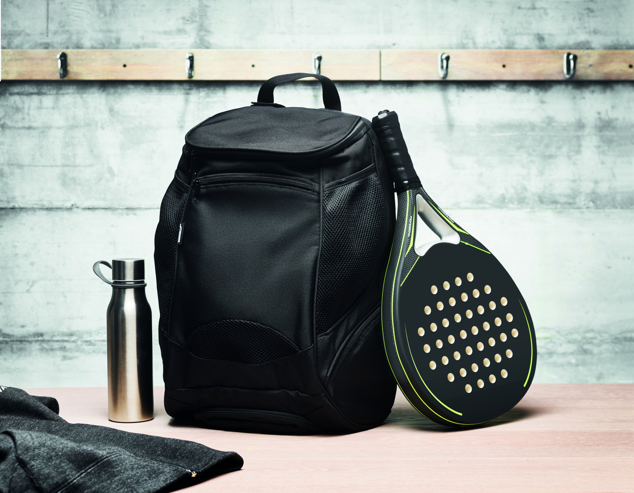 Multifunctional 600D RPET sports rucksack with several compartments (including padded compartment for paddle racket). Includes adjustable shoulder strap.