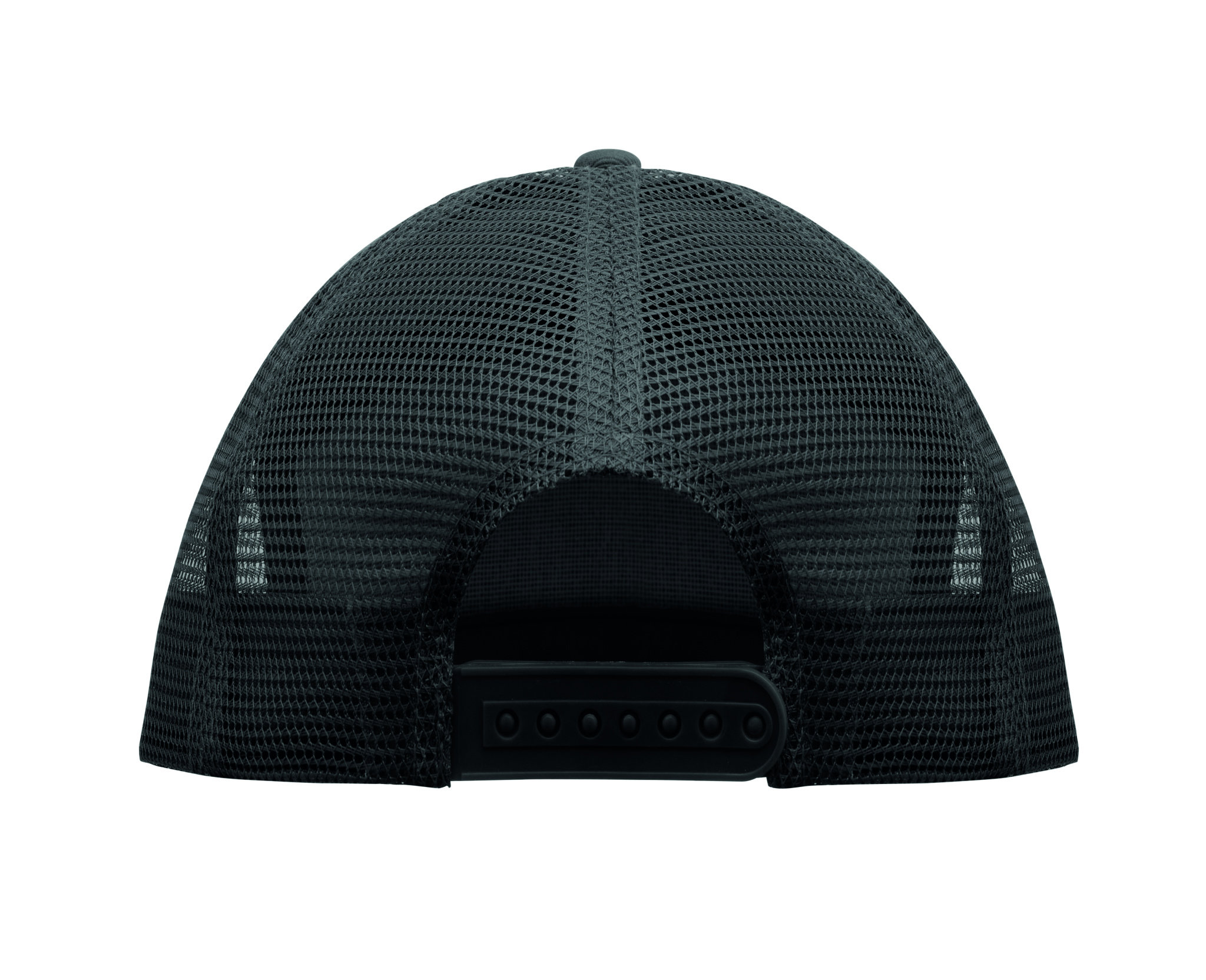 7 panel flat visor cap in cotton twill 235 gr/m² with polyester mesh backside and plastic closure.