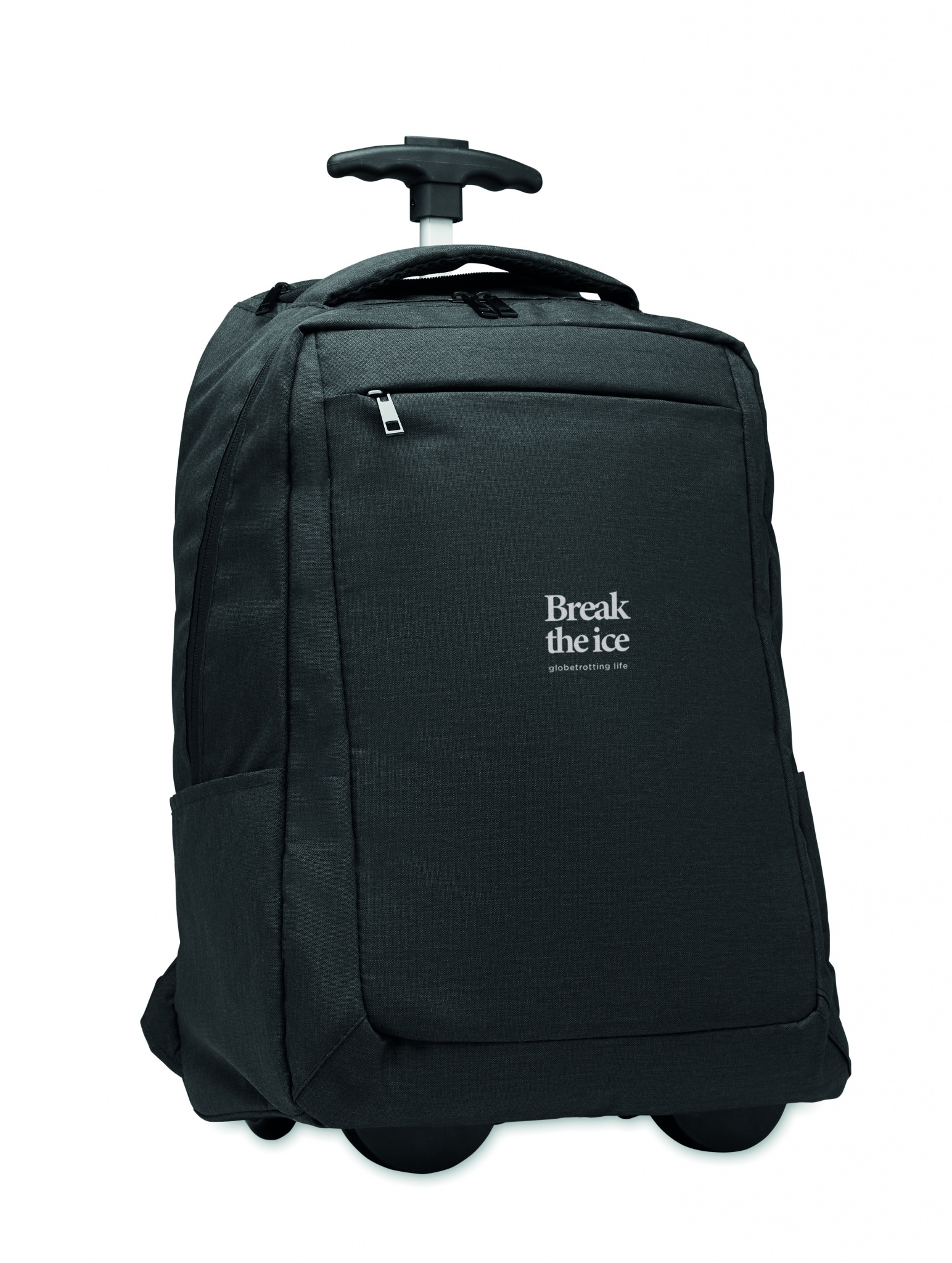 Laptop backpack trolley with wheels in 600D RPET polyester. Includes one internal 15 inch laptop compartment. Zippered front pocket. Two side slip pockets. Three inner slip pockets. Padded back and shoulder straps. 2 wheels and double tube frame.
