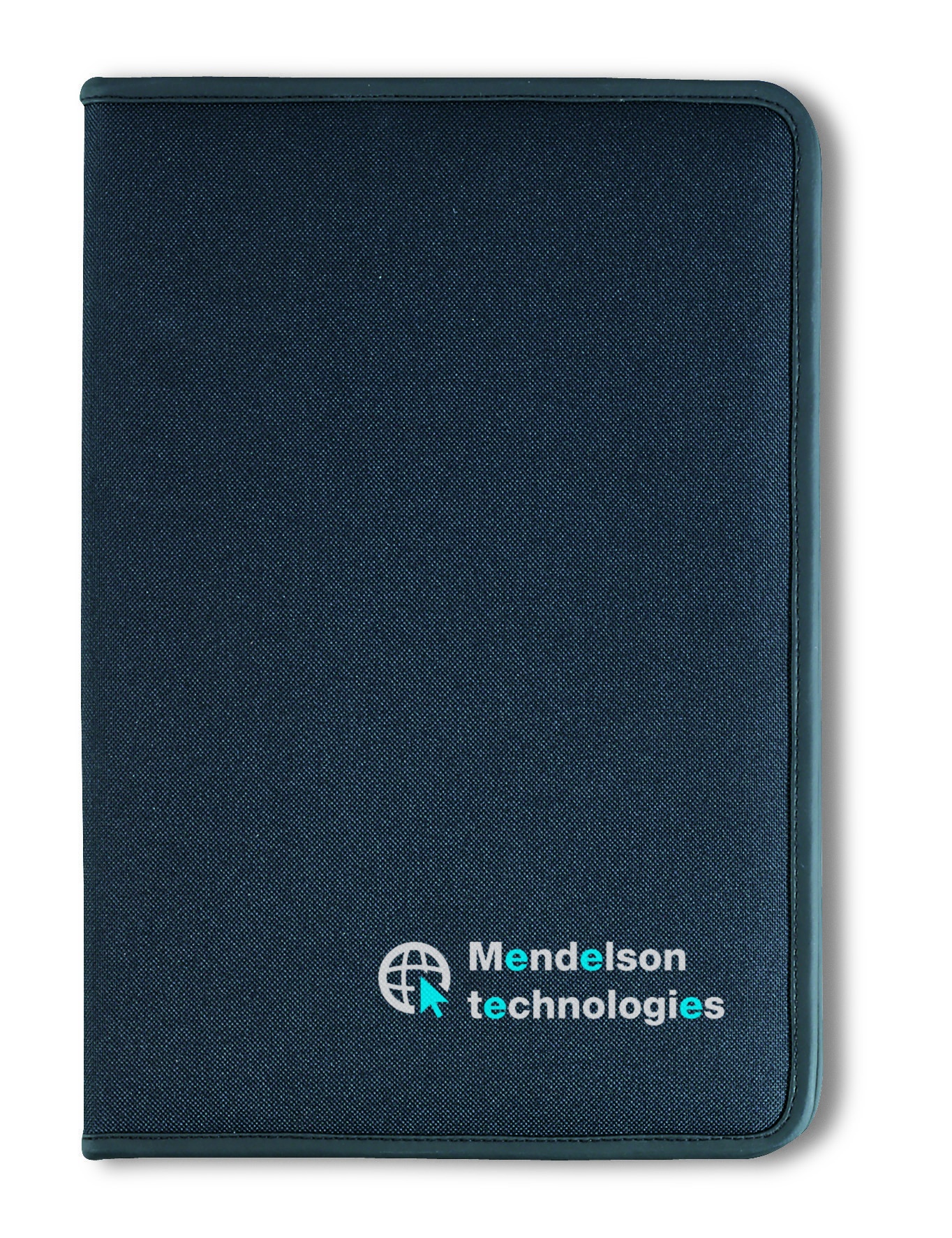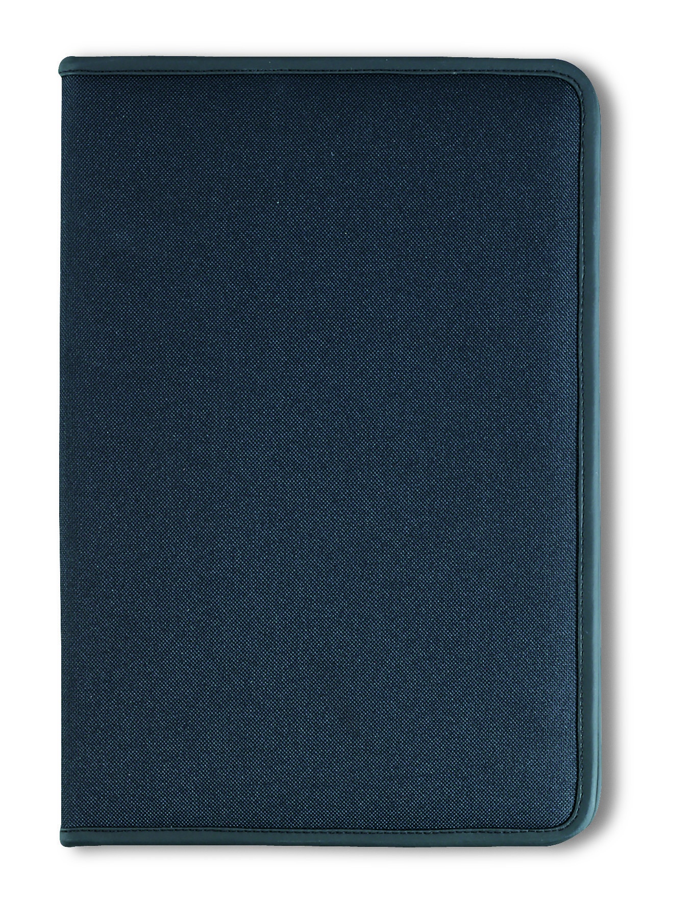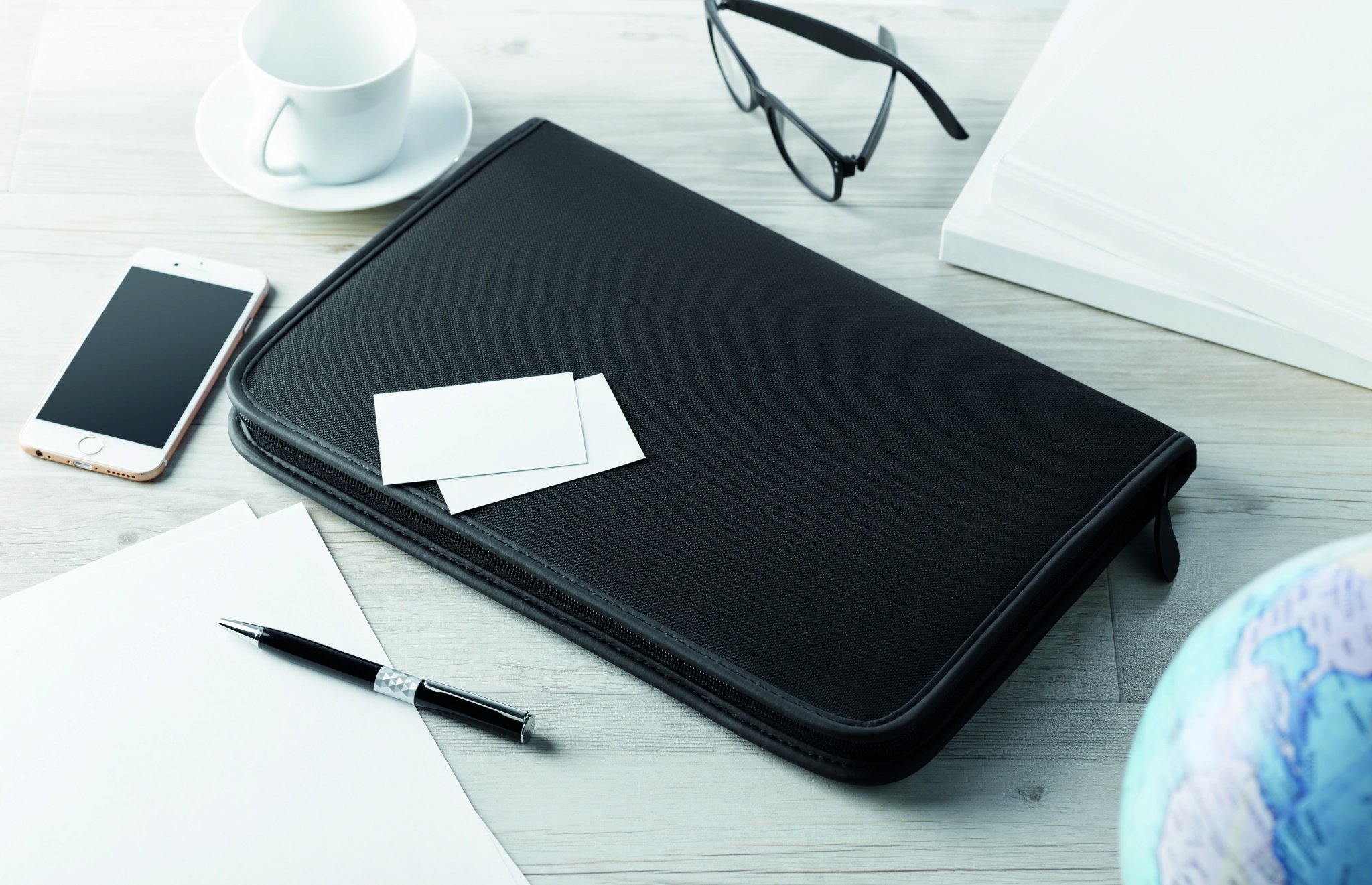 A4 conference folder. 600D polyester and 210T lining. Zipped. A4 20 lined sheets notepad. 4 compartments. Card holer.