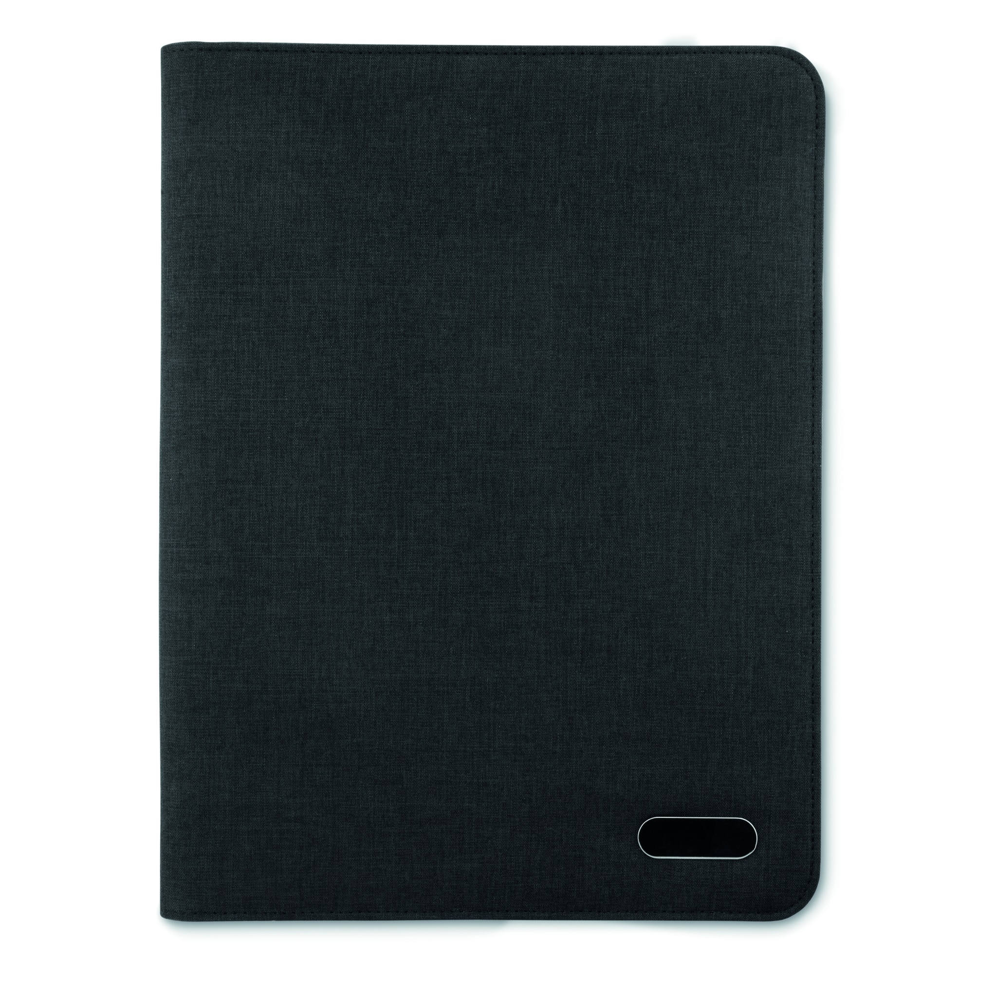 A4 conference folder in two-toned polyester. Zipped. 20 lined pages notepad. 3 compartments. Pen holder.