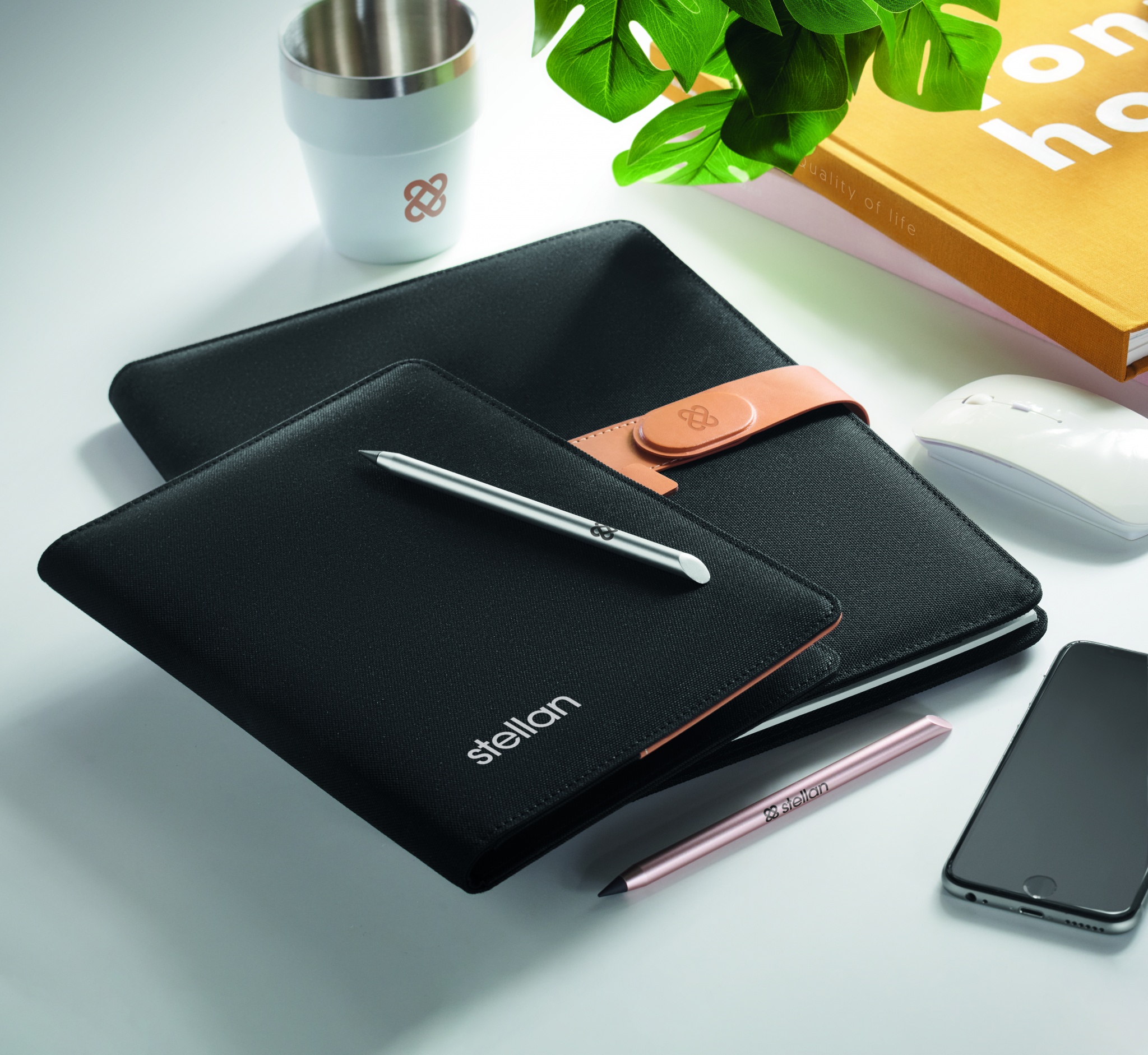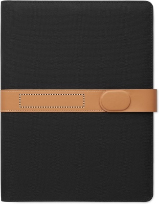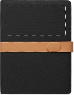 A4 portfolio in RPET with faux leather details. Replaceable A4 notepad.30 recycled paper lined pages. Pen holder. 4 cardholders, 3 small pockets and one big compartment. Magnetic strap closure.