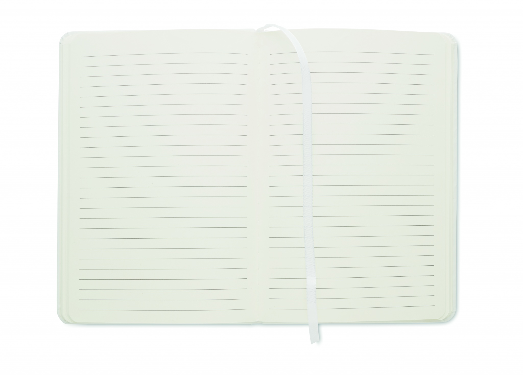 A5 notebook with antibacterial hard PU cover with nano silver based active agents inhibiting and preventing the growth of at least 99% of bacteria. Casebound. 192 lined pages (96 sheets). Matching elastic closure strap and ribbon page-marker. Conforms ISO 22196.