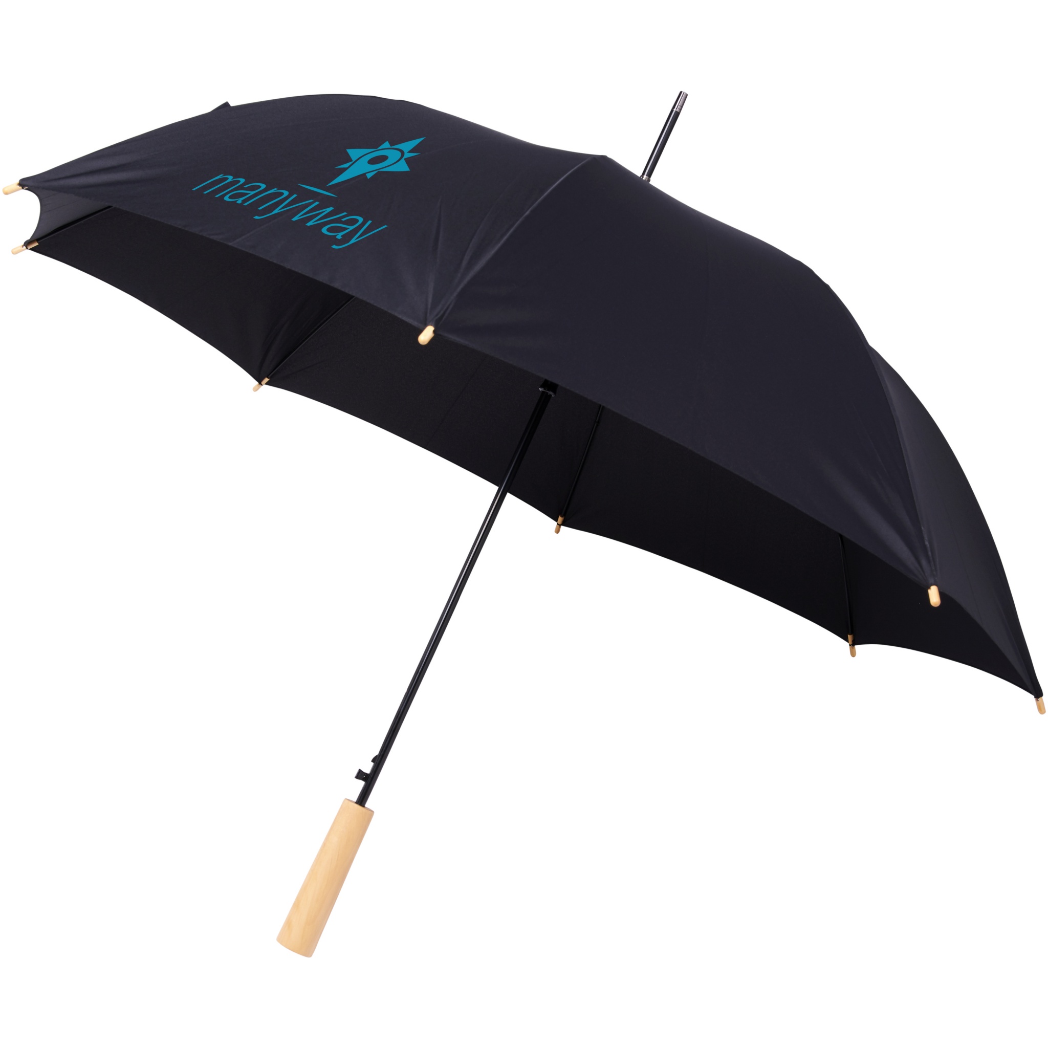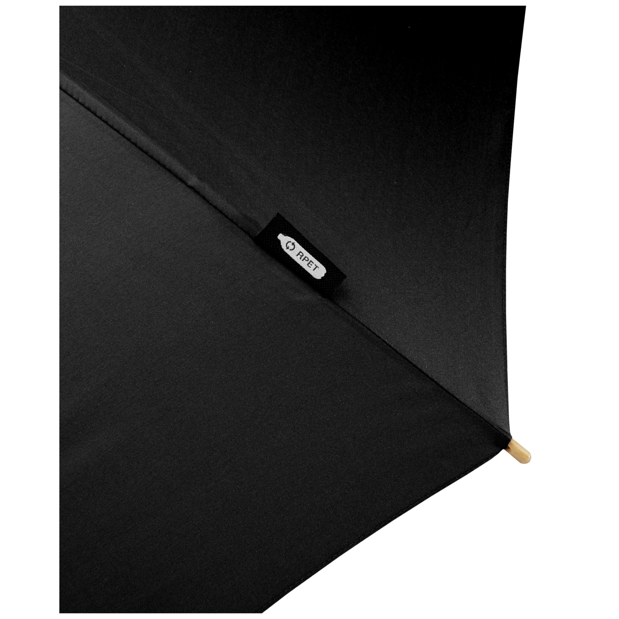 Automatic opening umbrella with a recycled PET pongee polyester canopy. Sturdy metal shaft, a high quality frame with fibreglass ribs offering flexibility in windy conditions. Together with the wooden handle, tips, and the recycled PET pongee polyester canopy it offers a sustainable choice. Available in a wide variety of contemporary colours with an large decoration area on each of the panels.