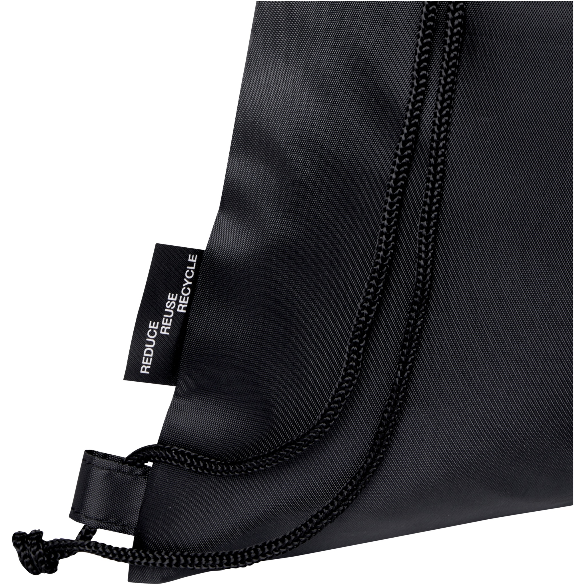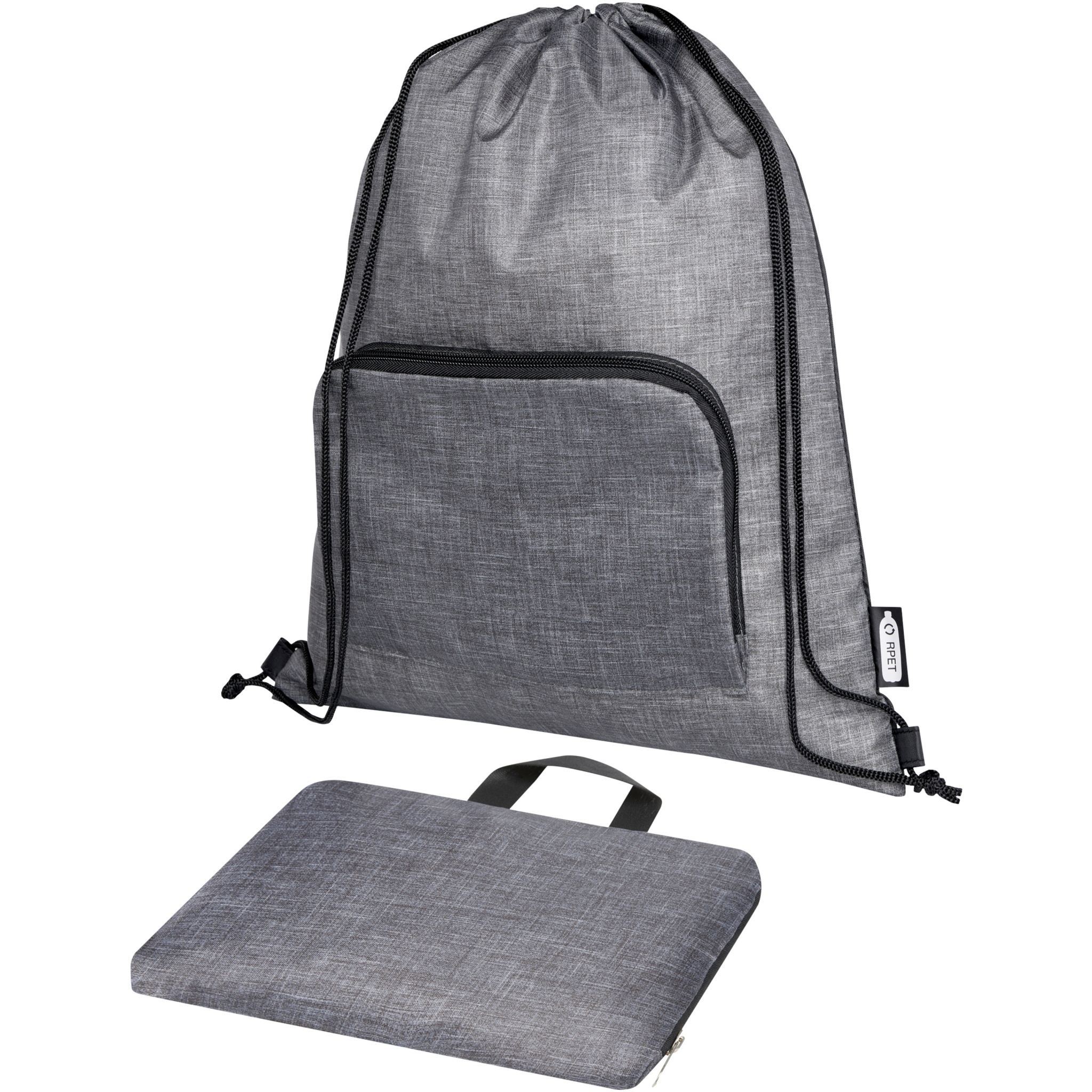The Ash foldable recycled drawstring bag features a main compartment with cinch closure, and a zippered front pocket that the bag can easily fold up into for easy transport and storage.