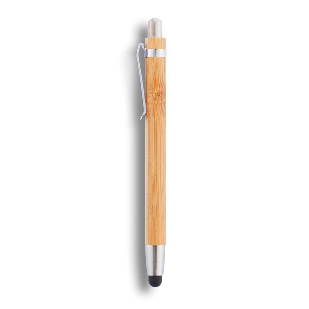 Bamboo touch pen with integrated stylus tip and ballpoint.