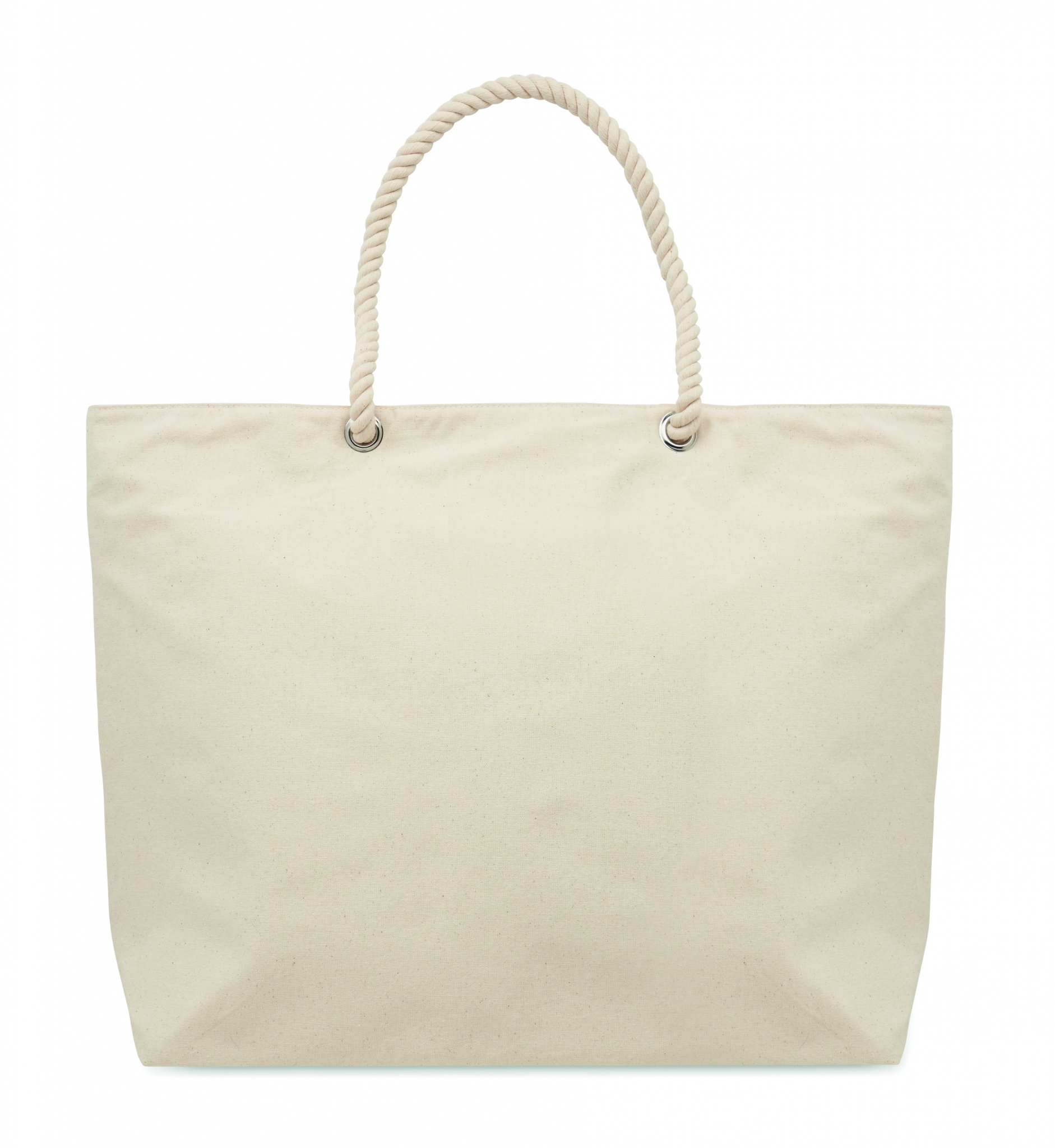 Zippered beach cooler bag in cotton with cord handle. 220 gr/m². 2mm aluminium foil insulation.