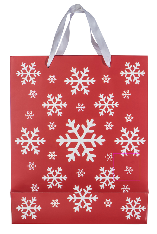 Large christmas gift bag made of paper with snowflake design and two handles. We will print your logo on a label.