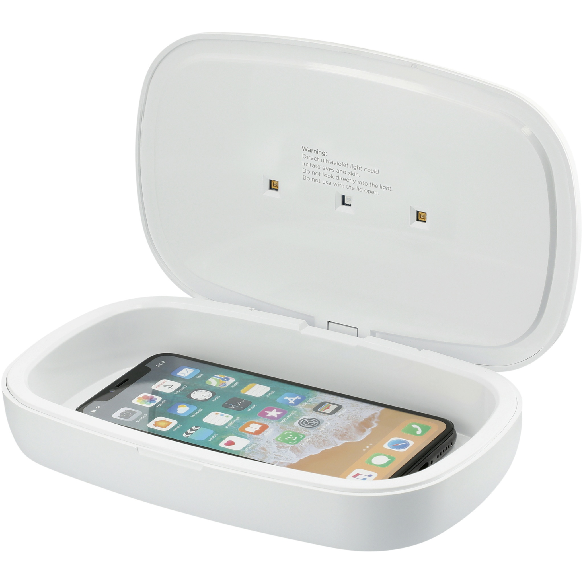 The Capsule UV smartphone sanitizer with 5W wireless charging pad can charge and clean your smartphone thanks to the built-in UV-C LED lights. There are 2 levels of sanitizing available. Press the button once for a short 90 second sanitation. Press the button twice for a 5-minute-deep clean sanitation. Next to smartphones, the Capsule can sanitize anything that fits inside the box, such as keys, earbuds, and other personal belongings. It has been tested to eliminate up to 99.9% of bacteria such as Escherichia coli, Staphylococcus and Candida albican. The product cannot be powered on when the cover is open, to protect the user from UV light exposure. When the case is opened during the process of sanitizing, the sanitizer will immediately stop to prevent any eye/skin exposure. Packed in a premium gift box. Inner dimensions: 181 x 104 x 26mm.
