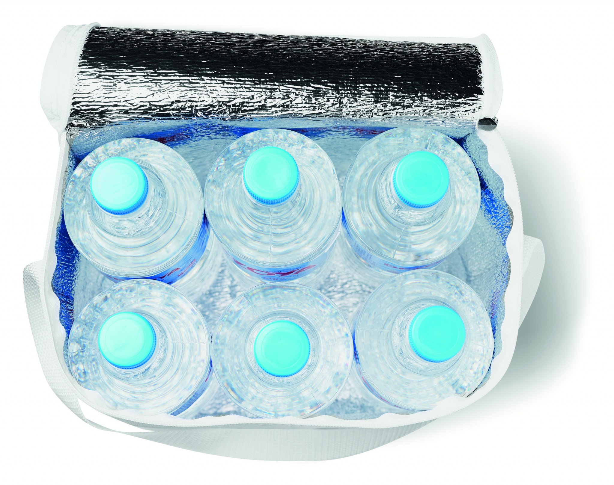 Cooler bag for 6 1,5l bottles in 210 polyester. With non woven white trimmings. 80gr/m². Isolation material: aluminium foil. Capacity 12,5L.
