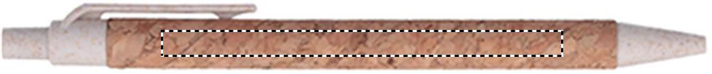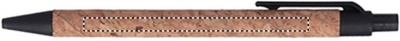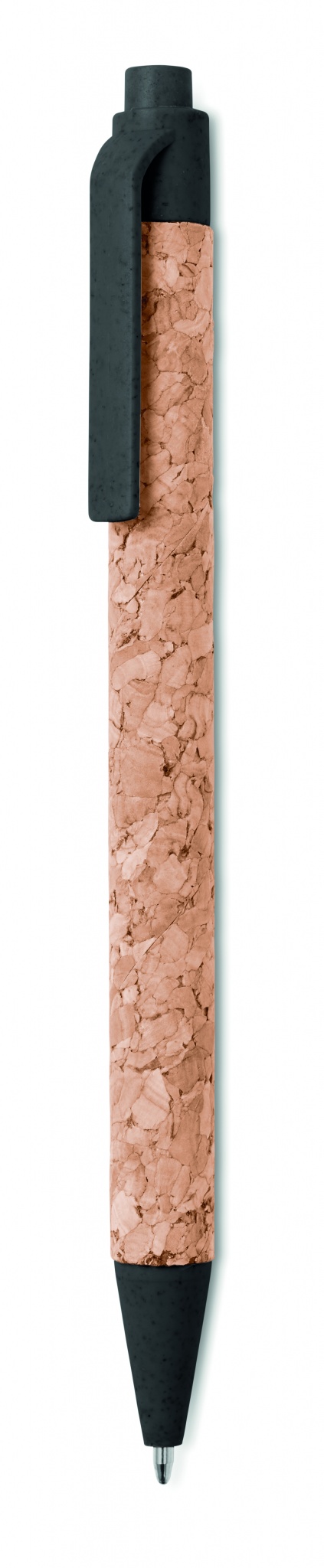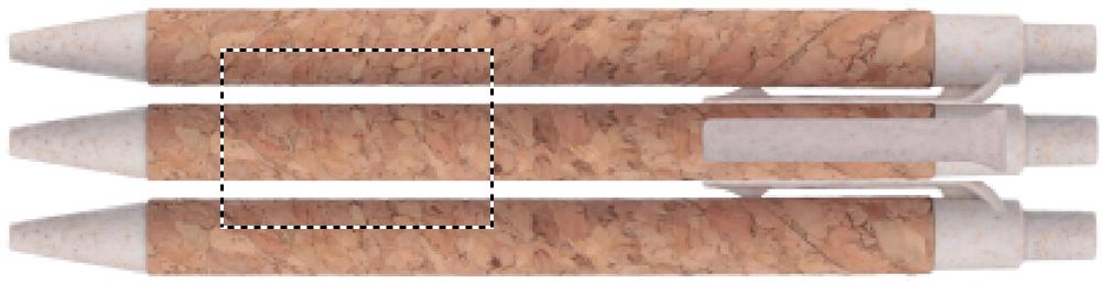 Push button ball pen with cork barrel and wheat straw (50%) and ABS plastic (50%) fittings. Blue ink. Cork is a natural material, due to its structural nature and surface porosity the final print result per item may have deviations.