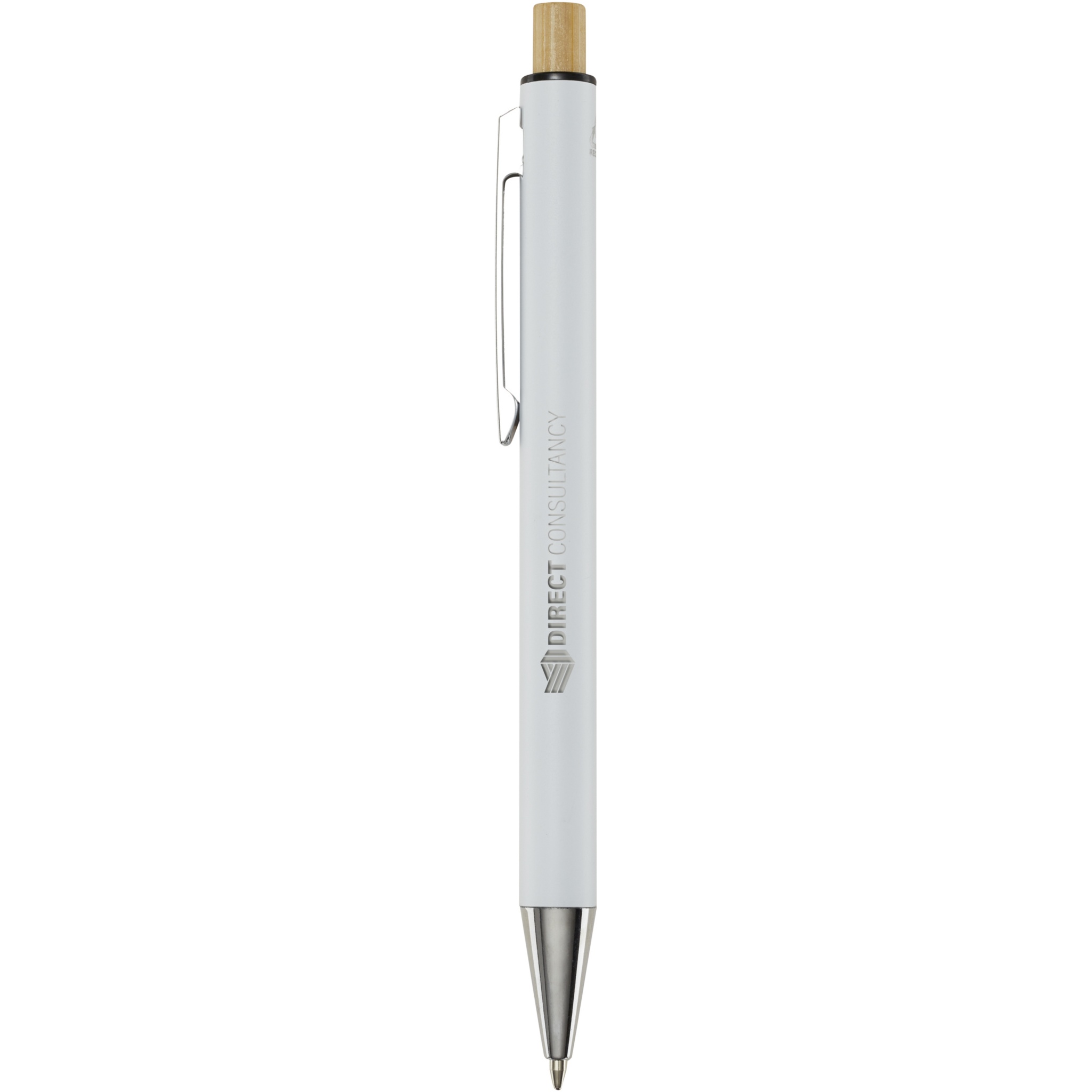 The Cyrus ballpoint pen is made from recycled aluminium, which requires less energy than producing aluminium from raw materials. It also reduces the amount of waste in landfills and helps to conserve natural resources aiming to reduce greenhouse emissions. The push button is made of bamboo. Ink colour: Blue. Writing length: 800 metres. Nib size: 1.00 mm.