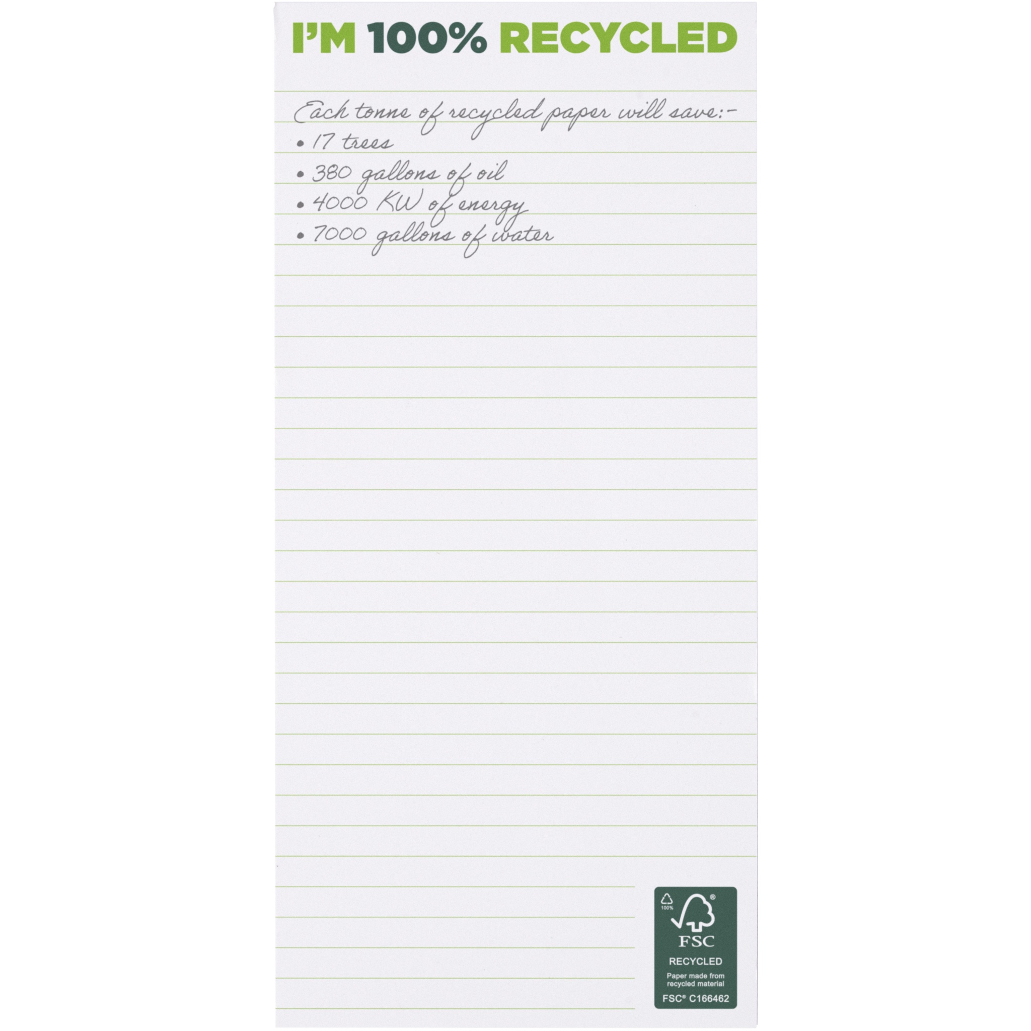 White 1/3 A4 Desk-Mate® notepad with 80 g/m2 recycled paper. Full colour print available on each sheet. Available in 3 sizes (25/50/100 sheets).
