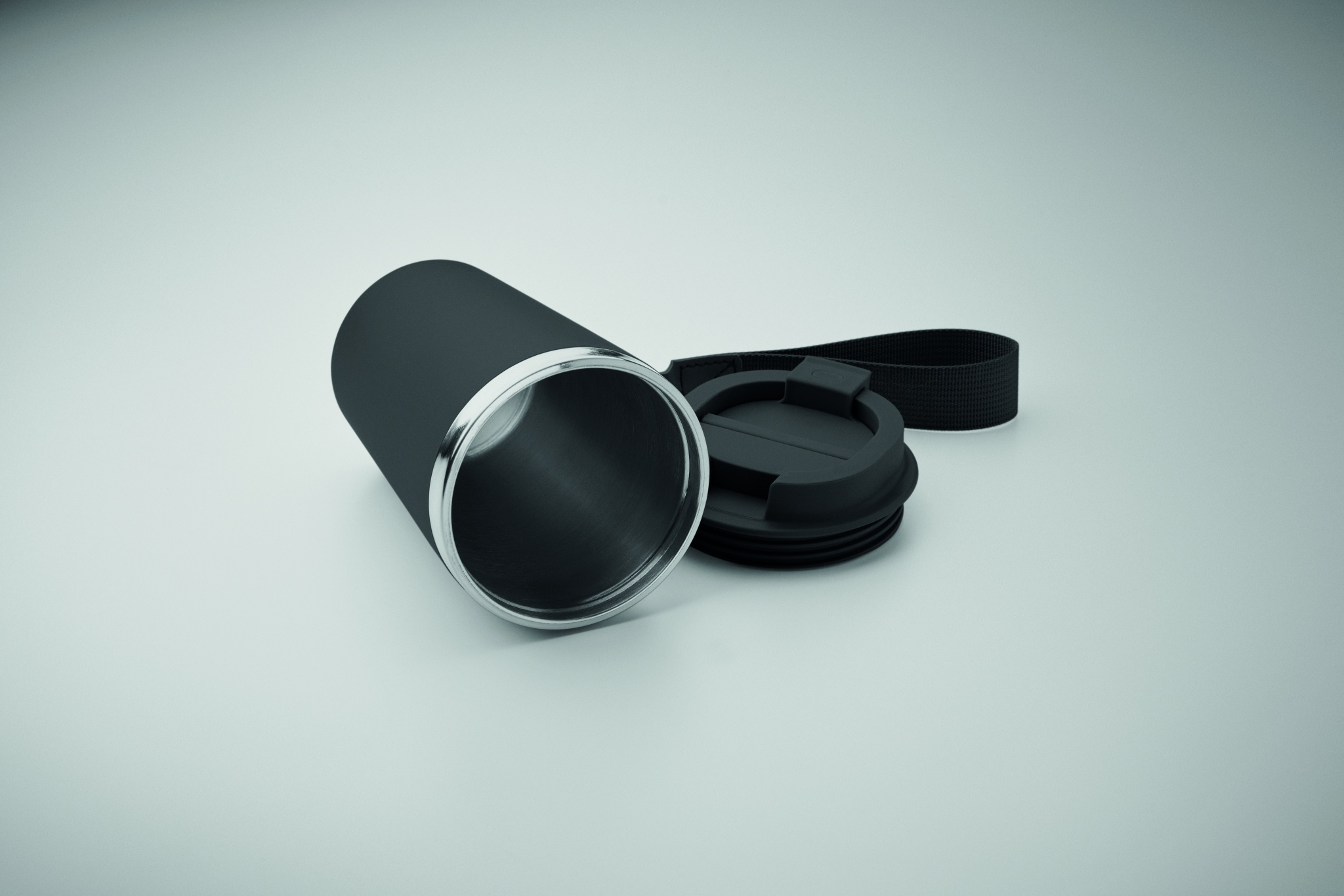 Double wall tumbler in recycled stainless steel (90% recycled stainless steel and 10% stainless steel) with recycled PP outside layer with RPET wrist strap. Leak-free. Capacity: 350 ml.
