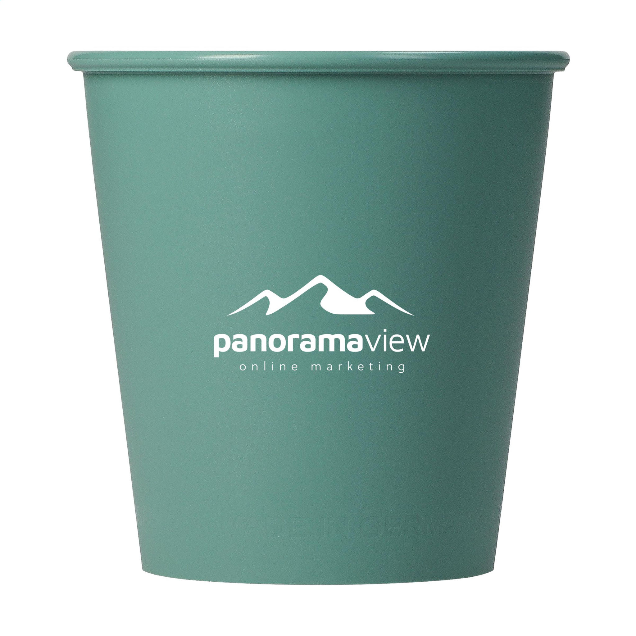 Reusable drinking cup made from bio-based material from renewable sources. This stackable cup is a good alternative to the disposable coffee cup. Fits under almost any coffee machine. 100% recyclable and BPA-free. This product is dishwasher-safe. Washing by hand is recommended to preserve the imprint. Capacity 200 ml. Made in Germany.