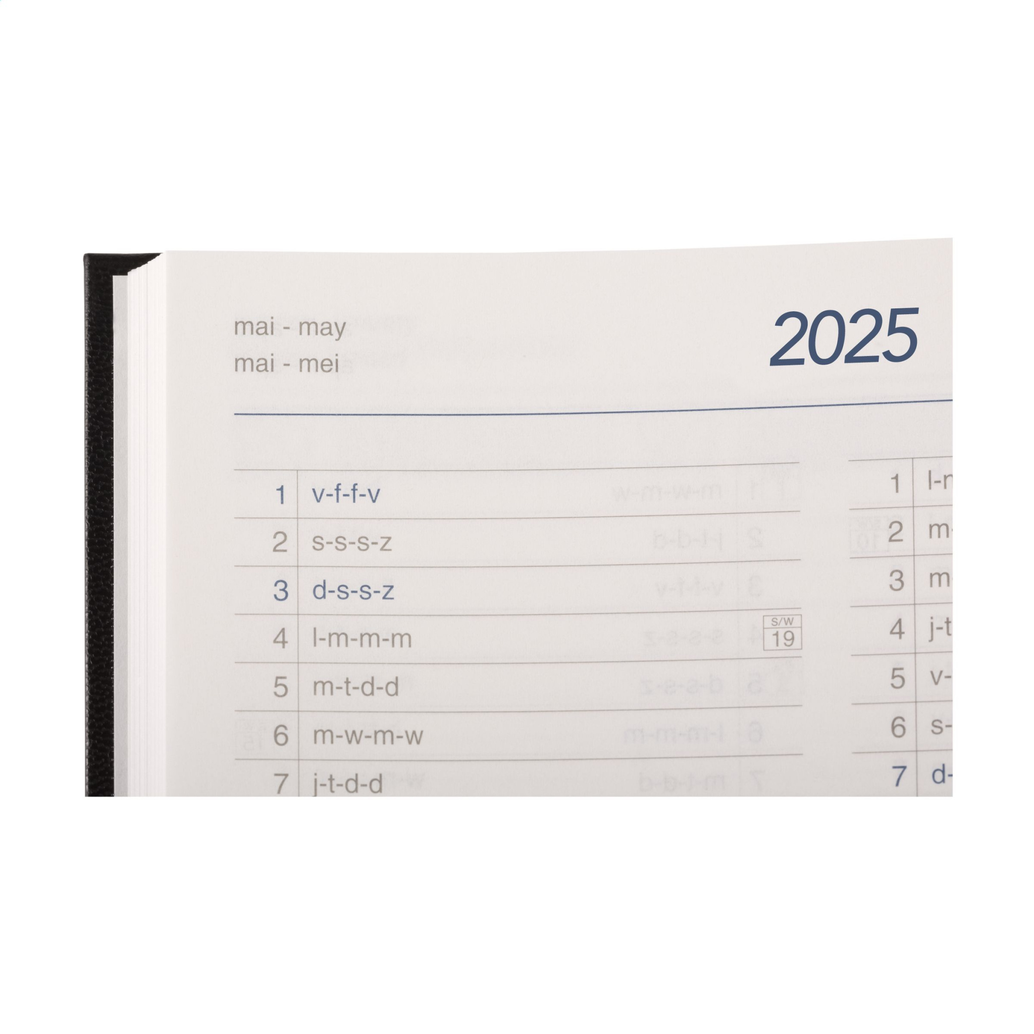 Four language office diary: EN, NL, F and D. With durable padded Balacron cover and the year embossed on the front. 80 g white, FSC Mix certified paper, large weekly overview across two pages, 2 colour print, thread bound, weekly overview on two pages, year planner current year and next year, extra useful information. Close to A5 size.