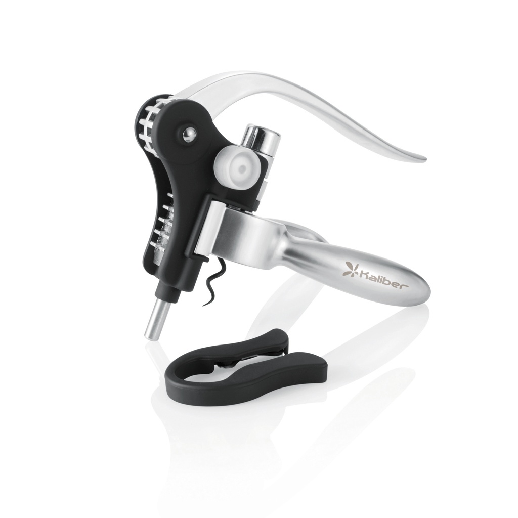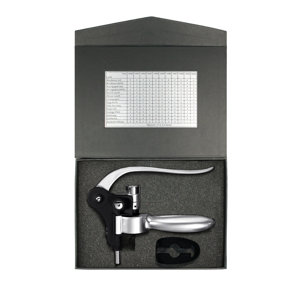 Corkscrew with lever mechanism made of aluminium, hardened steel and teflon coated spiral, including foil cutter and plaque with a review of the best wine regions as of 1990.