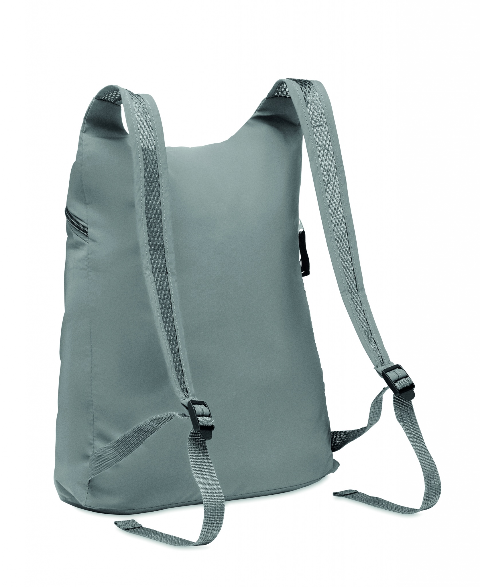 Foldable sports backpack in high reflective 190T polyester with zippered front pocket. Adjustable shoulder straps.