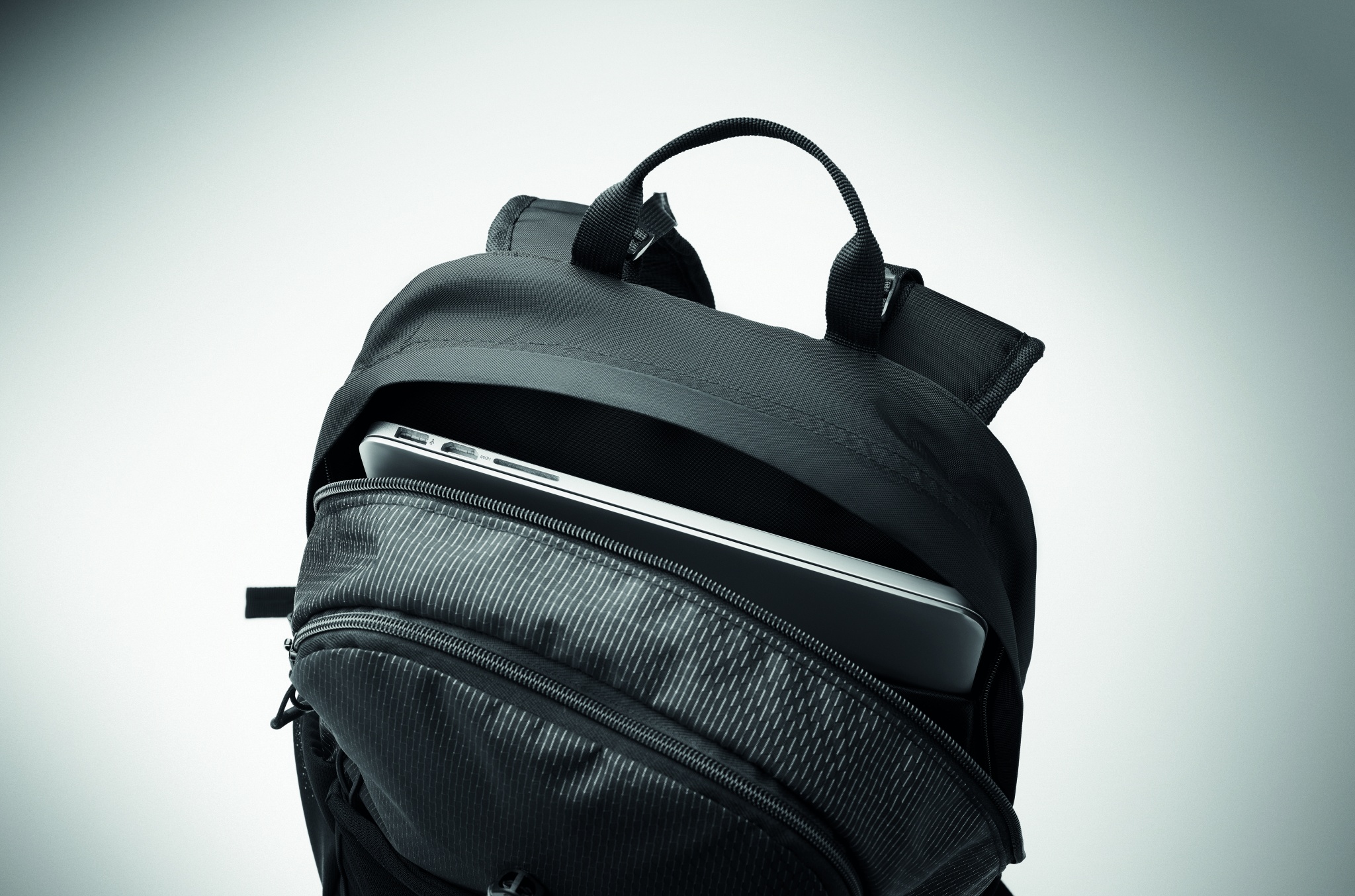 Hiking backpack 18L in water repellent 420D nylon with reflective stripe. It has a 15 inch laptop compartment. One front zippered compartment and one front slide pockets with buckle closure. Two side slide pockets. Padded back and shoulder straps. Ventilated back side.