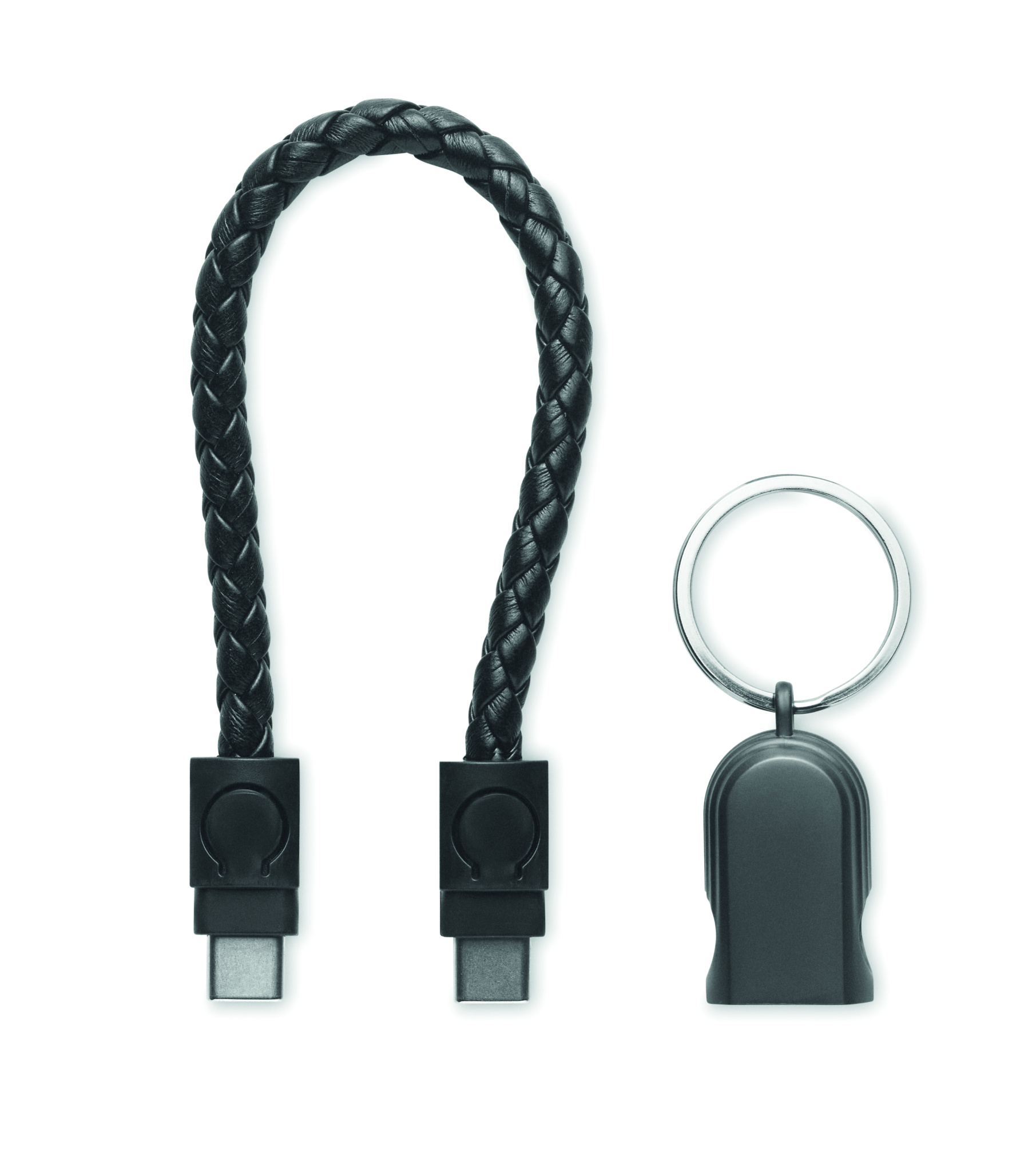 Key ring loop with charging and data transfer 60W cable type-C to type-C in PU with zinc alloy braided detail.