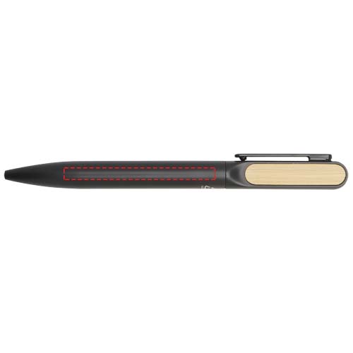 The Laura gift set includes an A5 RPET hard cover notebook, a ballpoint pen, a ceramic mug, and a coaster. The notebook has a black elastic closure and a ribbon marker, and 80 lined cream-coloured sheets of 80 g/m² paper. The notebook cover together with the bamboo semicircle functions as a phone stand. The ballpoint pen is made of RCS certified recycled aluminium with a black spray coating, and bamboo accessories on both sides of the upper barrel. Pen ink: Black. Writing length: 400 metres. The 480 ml ceramic mug comes with a bamboo coaster.