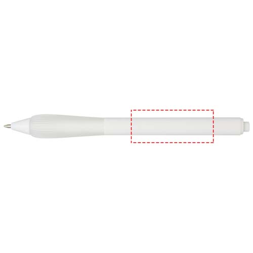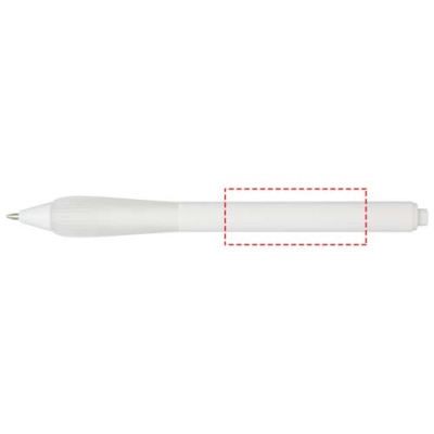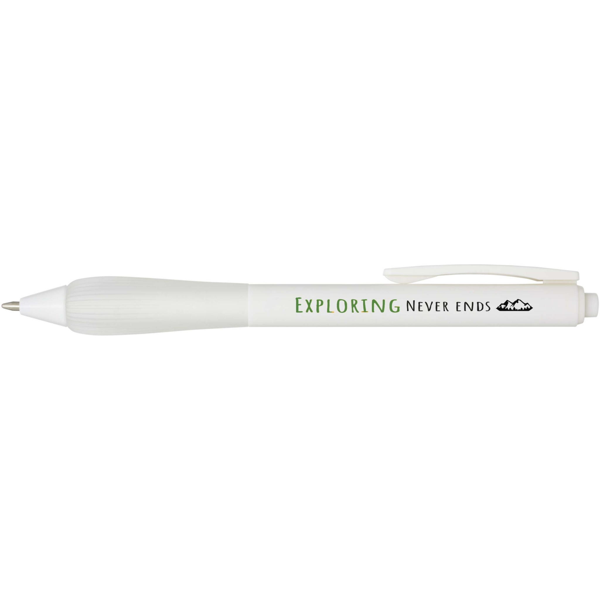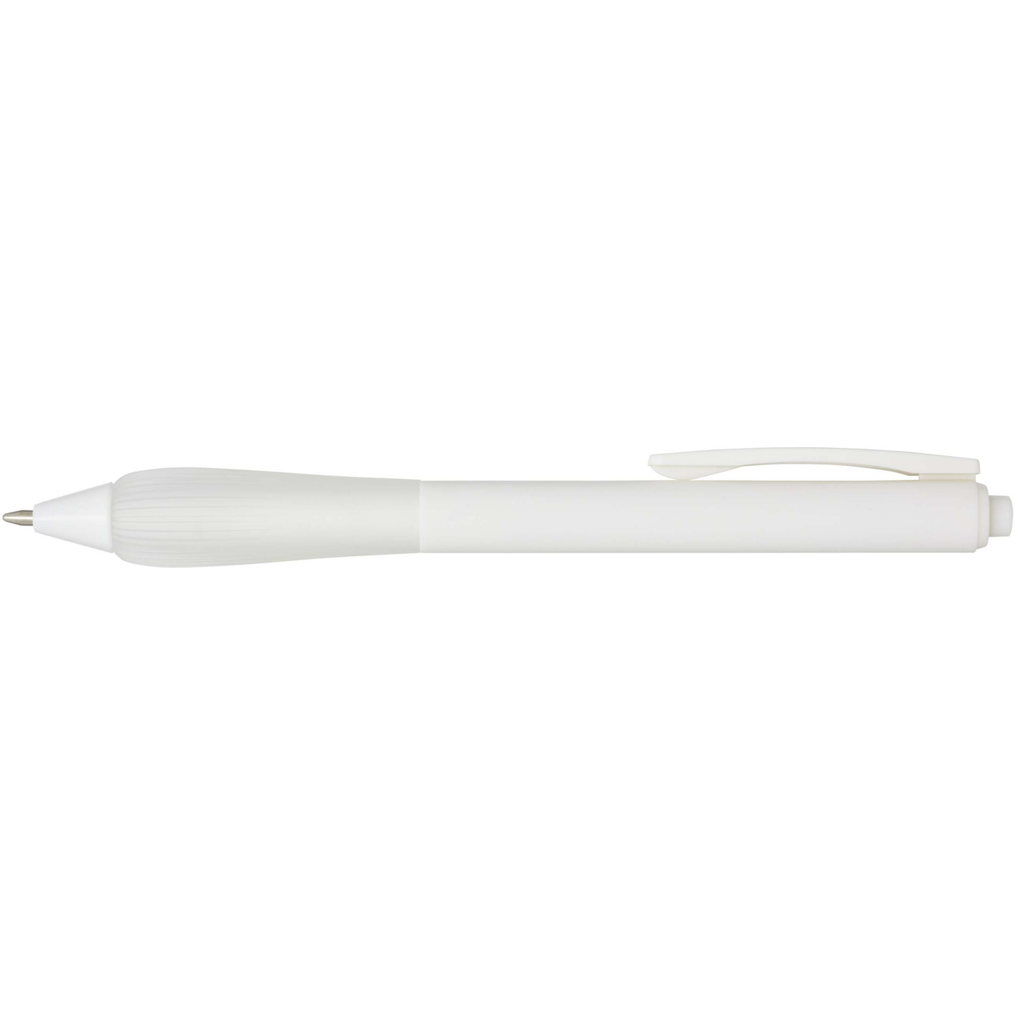 Recycled plastic ballpoint pen with a rubberized barrel, and grip made of TPR. Ink colour: Blue. Writing length: 1000 metres. Nib size: 1.0 mm.