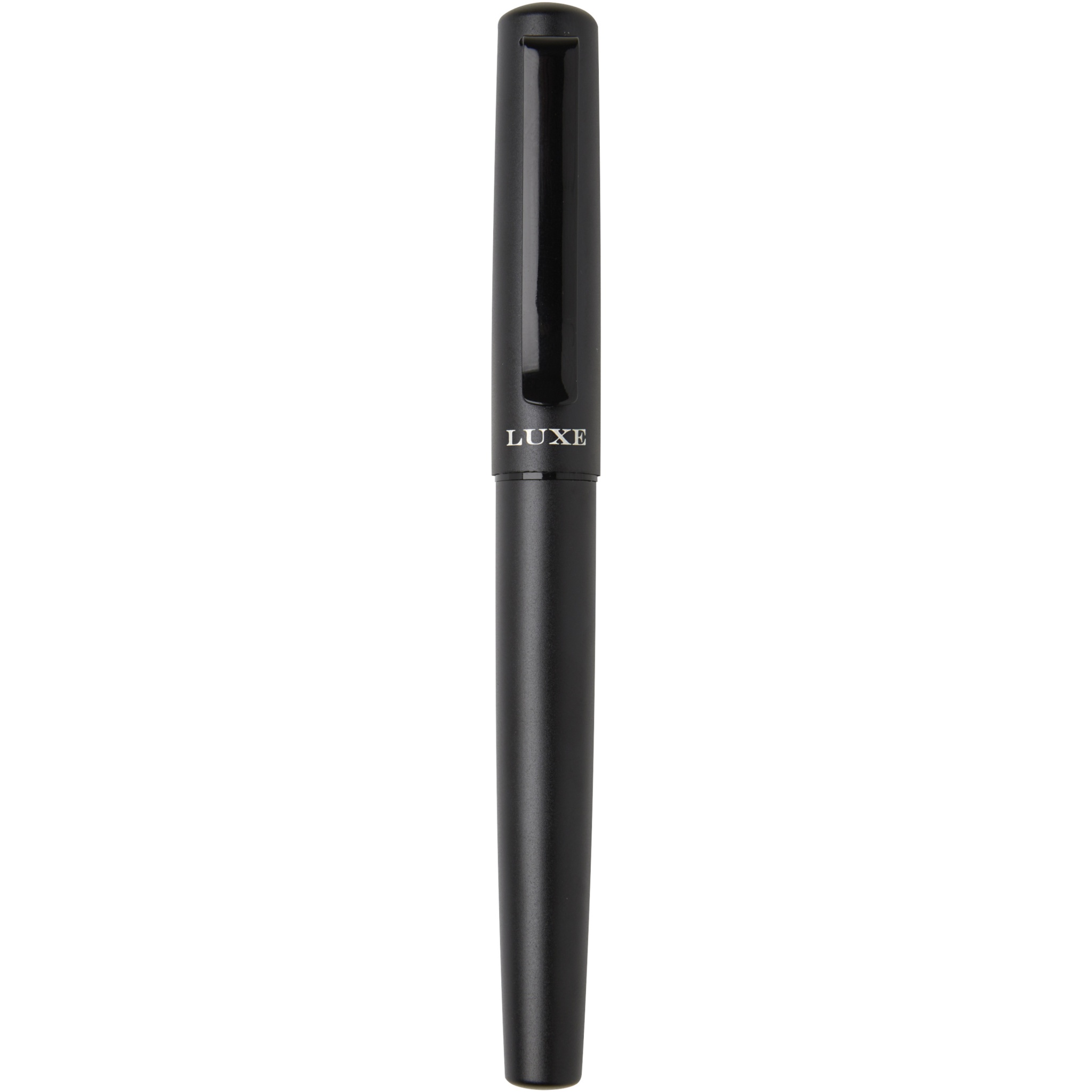 Fountain pen with a recycled aluminium barrel with matte black coating and a black recycled aluminium grip. Aluminium is a recyclable material and by choosing this pen, you can support more sustainable practices and give new life to discarded aluminium materials. This stylish fountain pen serves as a practical and more sustainable option for individuals and organisations looking for environmentally friendly writing instruments. Delivered with a black cartridge and a black gift box. Box size: 16.8 x 4.2 x 2.5 cm.