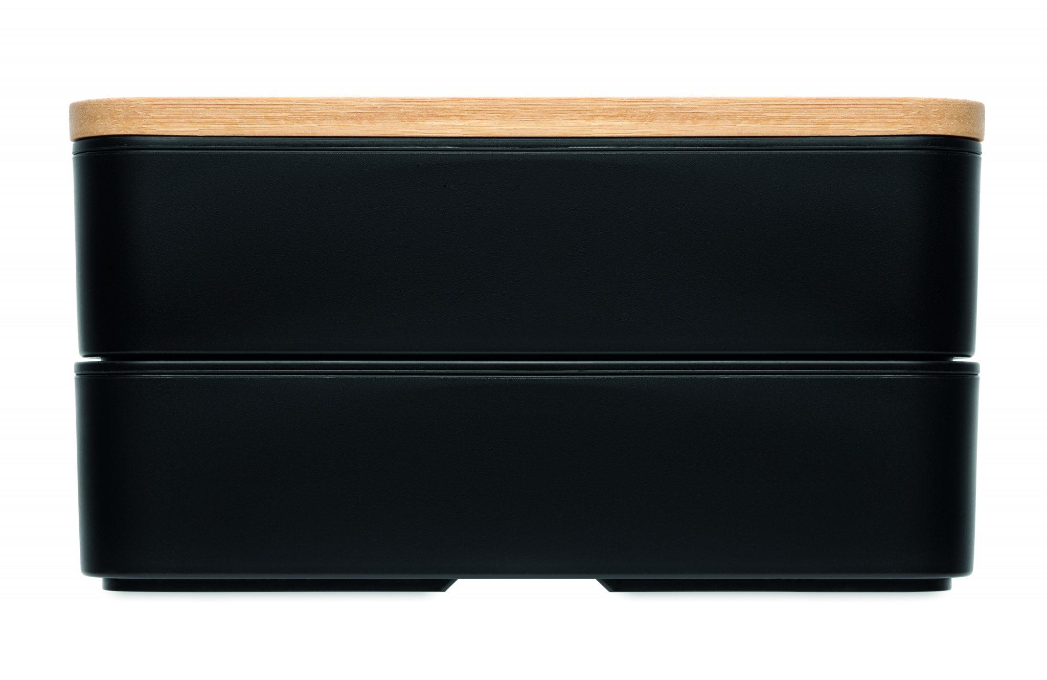 PP two-tier lunch box with bamboo lid including 1 removable PP divider and 3 cutlery utensils with attachable polyester band. Capacity 400ml (2x). Bamboo is a natural product, there may be slight variations in colour and size per item, which can affect the final decoration outcome.