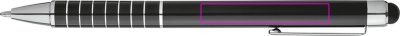 Twist ball metal pen with touch function and blue writing refill. 8 engraved rings make the writing convenient. Your logo will be laser engraved below the clip.