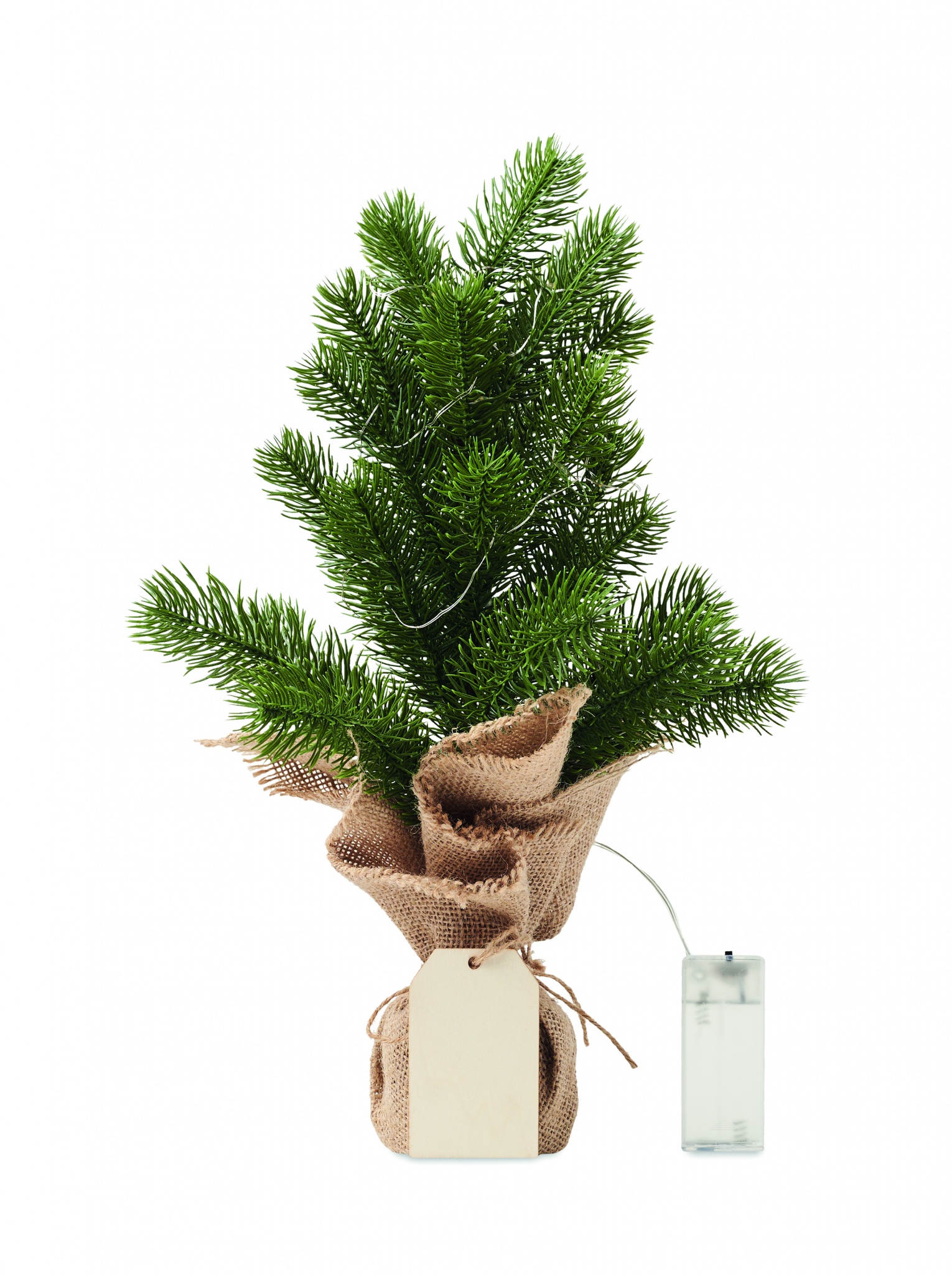 Mini artificial (PE) Christmas tree with 20 LED warm yellow string lights on a jute base. Comes with a wooden gift tag. 2 AA batteries excluded.