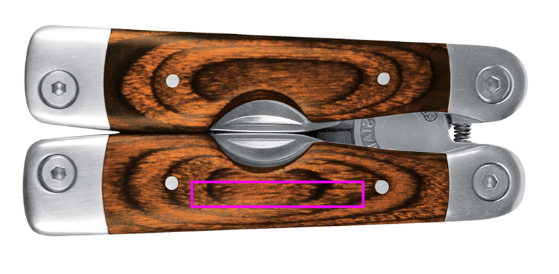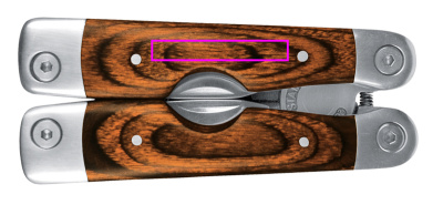 Stainless steel multifunction tool, with chic wooden shells on the handles: large pliers with cutting function, small saw with measuring unit and file, knife, Phillips screwdriver, three screwdrivers in different widths, small knife with cable insulation remover and can opener. The multitool comes in a belt pouch so you can always carry it with you. We will engrave your logo on the handle.
