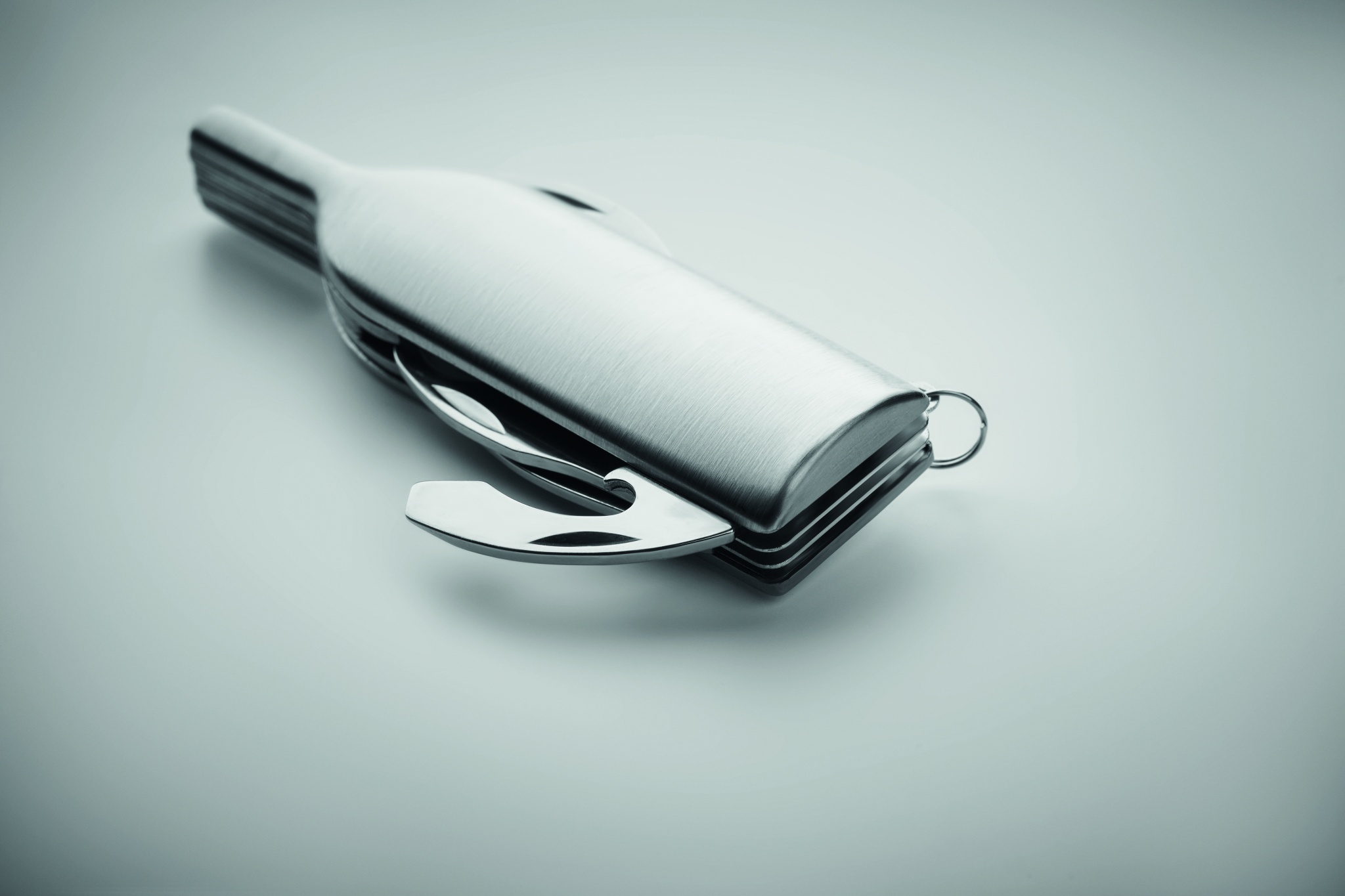 Stainless steel wine bottle shaped pocket knife with 6 functions: bottle opener, knife, corkscrew, foil cutter, magnifying glass and key ring.