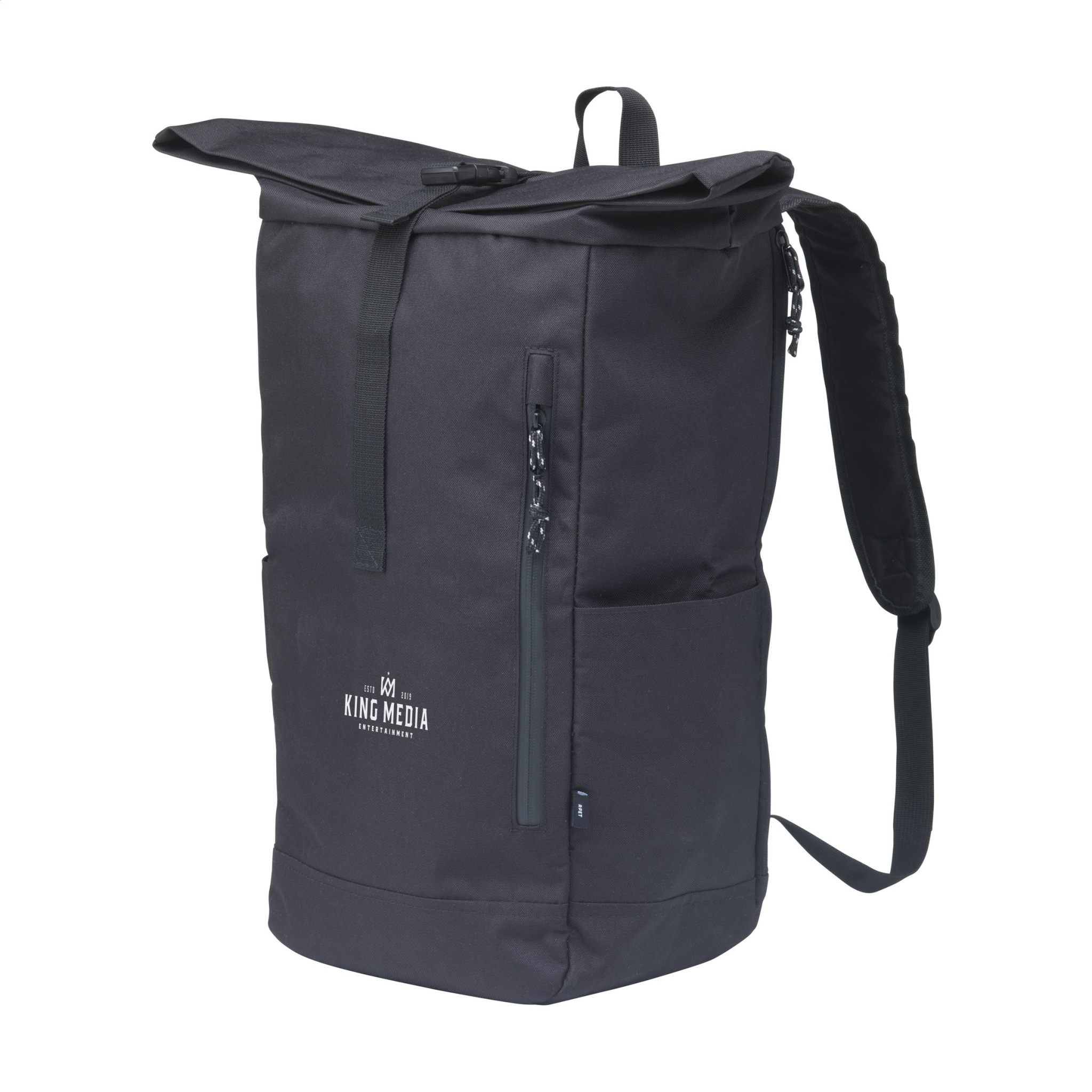 WoW! Practical, sturdy and water-resistant urban 'roll-top' cooler backpack made from RPET polyester. This backpack has a large inner compartment with a special cooling section. The cooling section is easily accessible via the top of the bag or via a practical and waterproof zip at the rear. The ideal bag for outdoor activities, picnics and food delivery. Includes a zip pocket on the front, two side pockets, padded foam back, adjustable shoulder straps, a carrying strap and a roll closure with a handy click system at the top. Capacity approx. 30 litres.