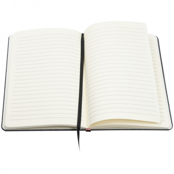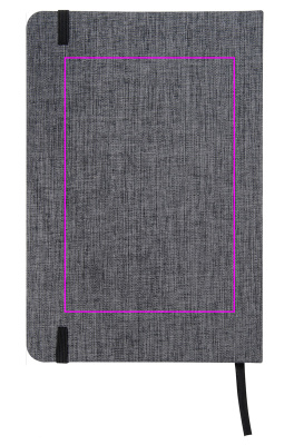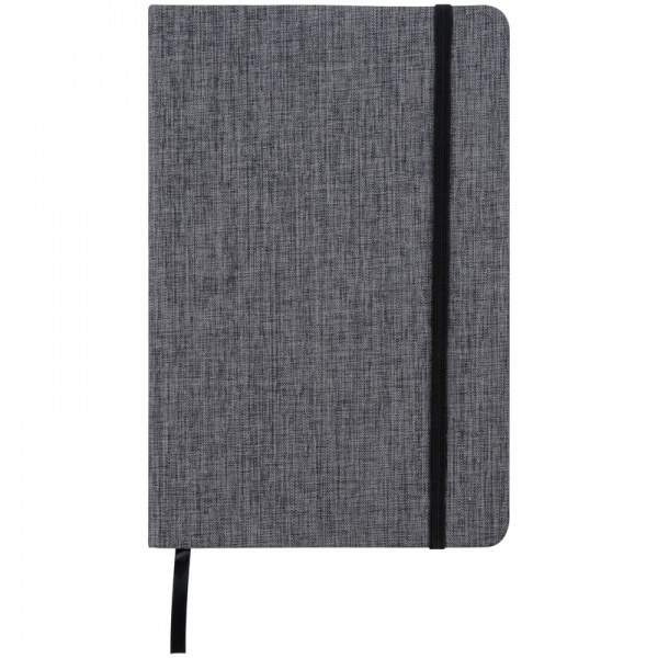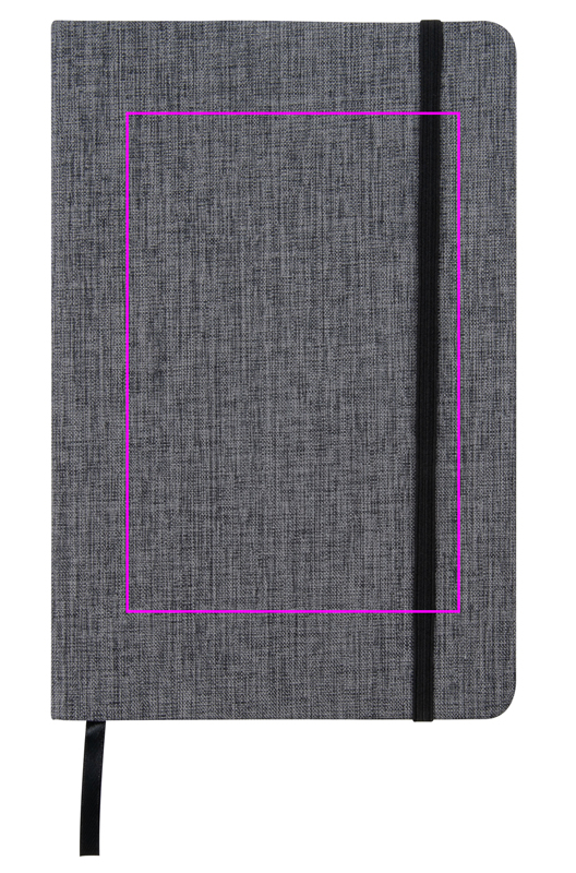 A5 notebook with a classy 300D canvas polyester cover, black rubber closure, and bookmark. 160 lined pages. We print your logo on the cover.