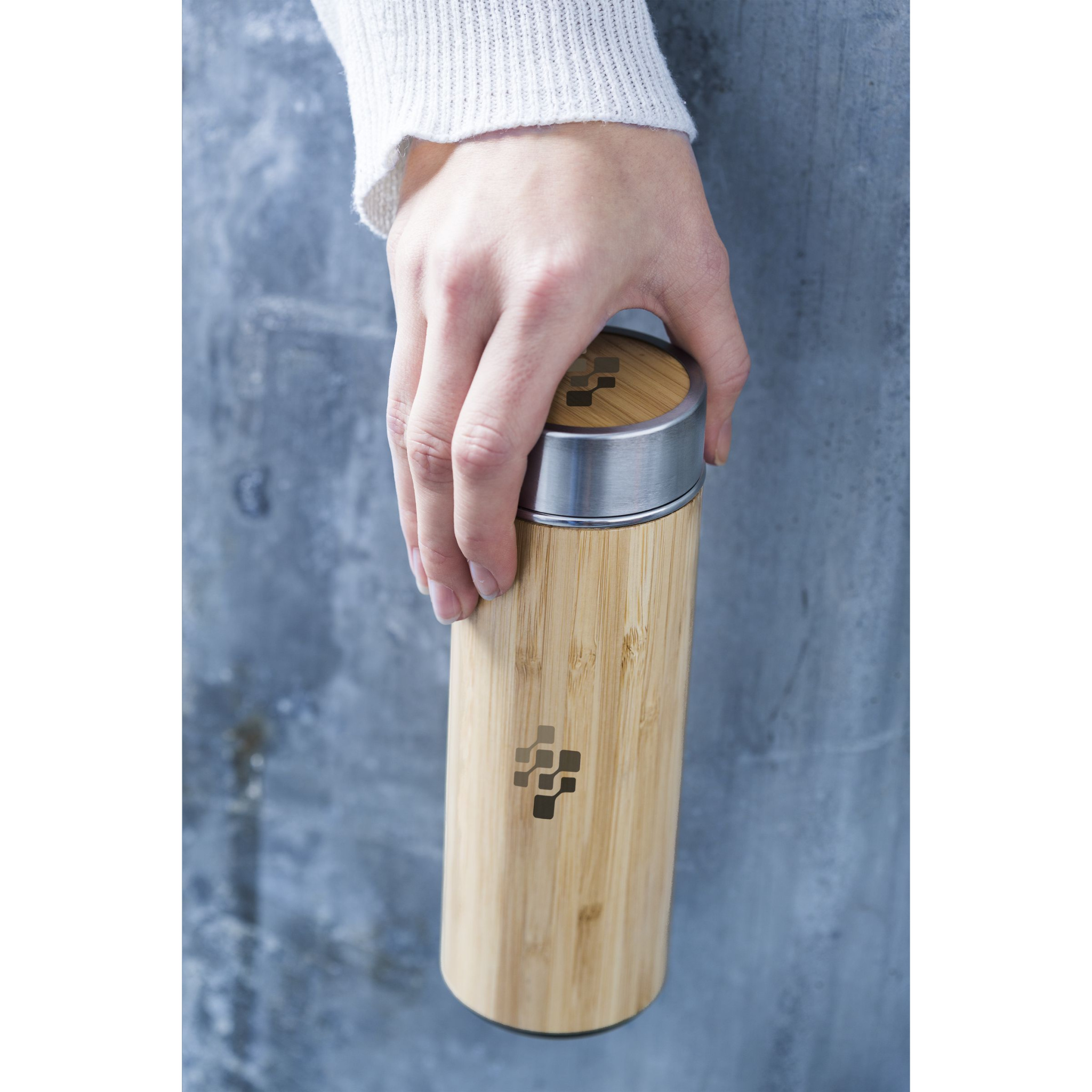 Double-walled, leak proof, vacuum-insulated stainless steel thermo bottle/thermo cup with bamboo finish. Includes a removable stainless steel tea strainer. Capacity 360 ml. Each item is individually boxed.